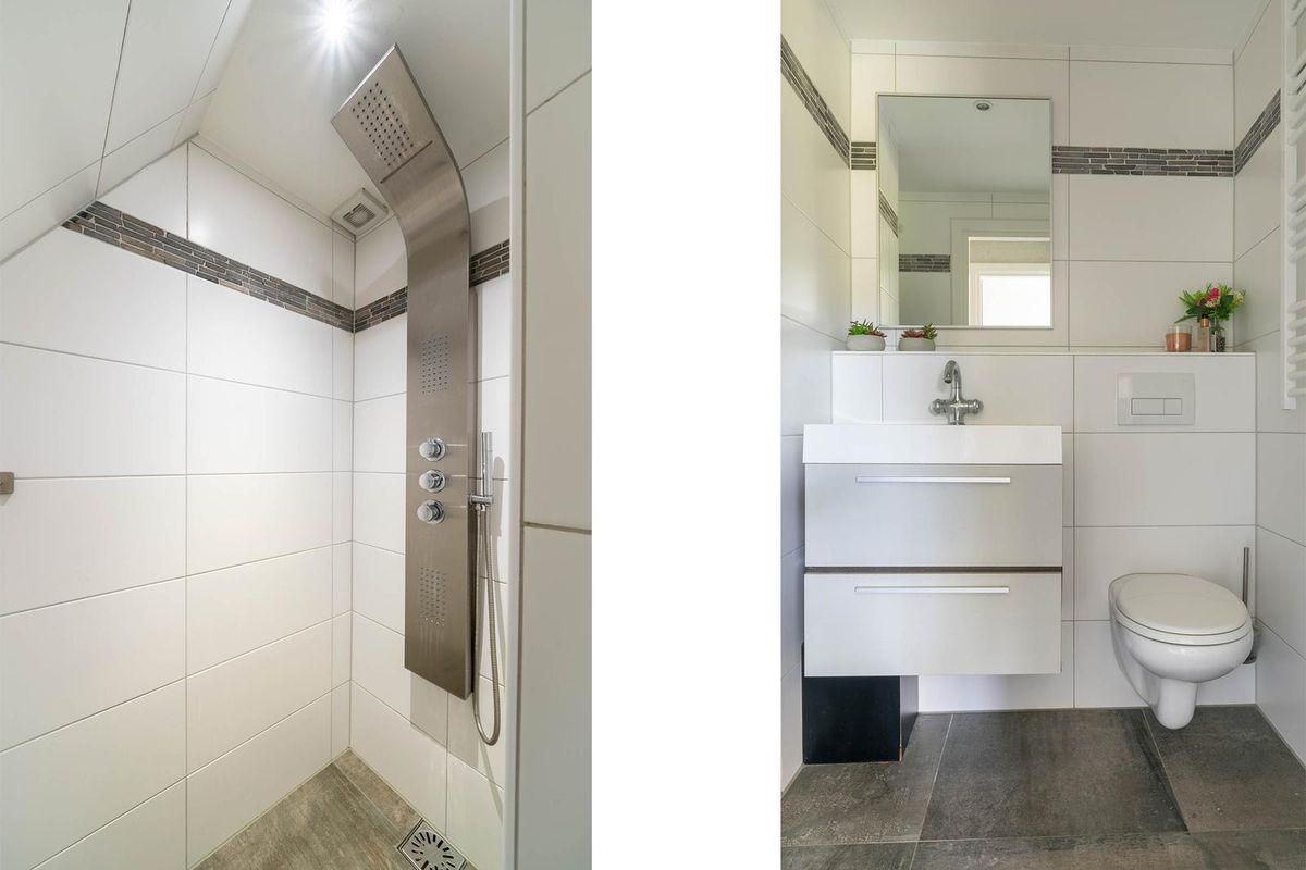 Op de begane grond bevindt zich verder een fijne tweepersoonsslaapkamer. In de tussenhal is de moderne badkamer te vinden, uitgerust met een luxe inloopdouche met massage-jetstralen, een wastafel met badmeubel en een designradiator. Natuurlijk is er ook mechanische ventilatie aanwezig. Tot slot brengt de trap in de tussenhal je naar de eerste verdieping.