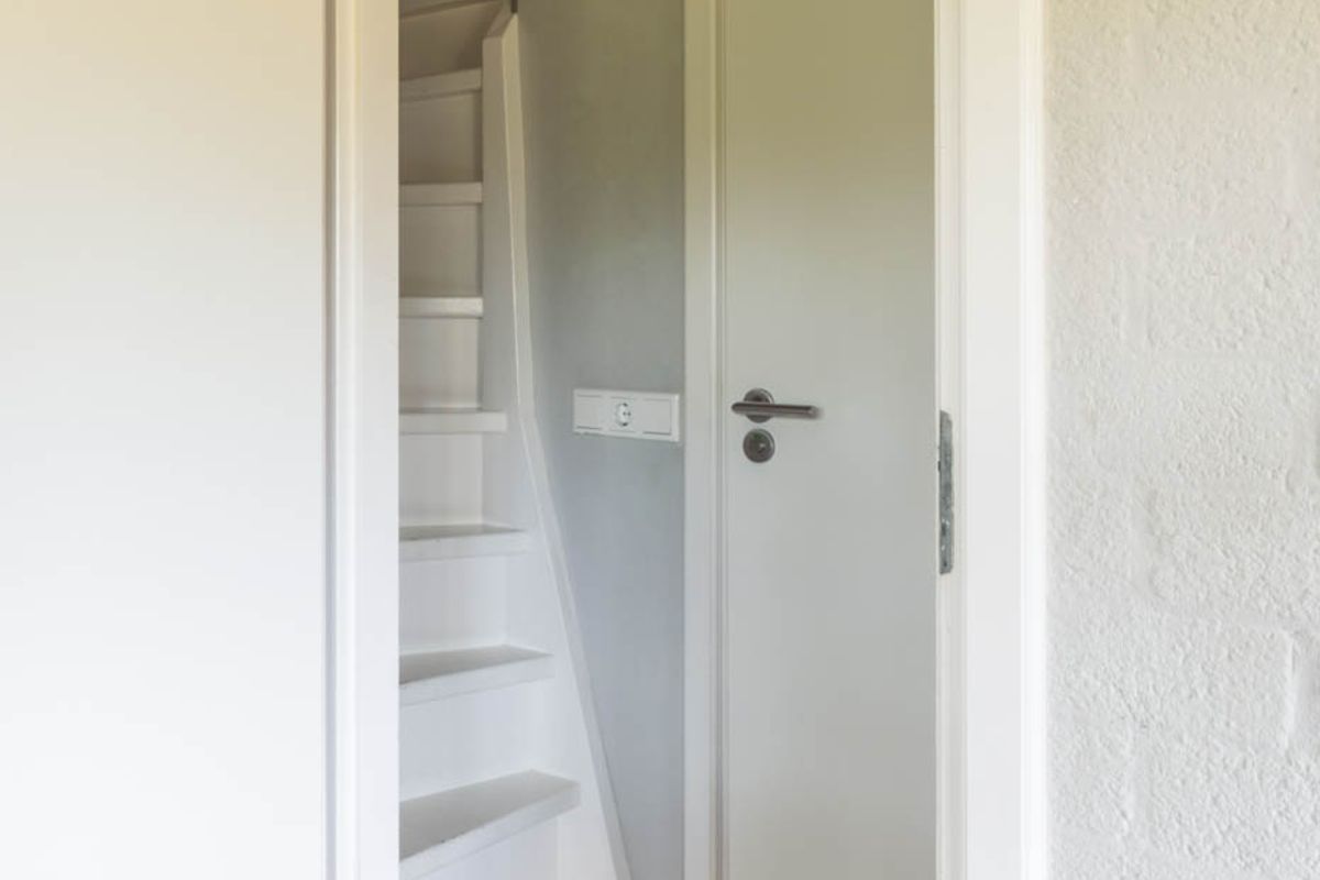 Boven aangekomen kom je direct in de eerste slaapkamer, waar het grote Velux-dakraam zorgt voor volop daglicht en een prettige sfeer. In deze kamer vind je ook de vlizotrap naar de bergzolder.