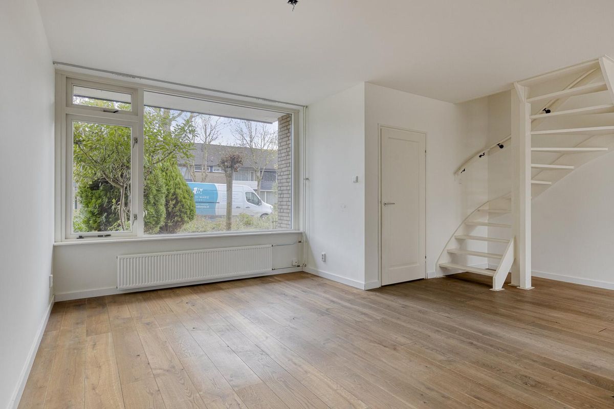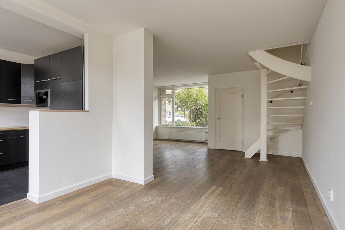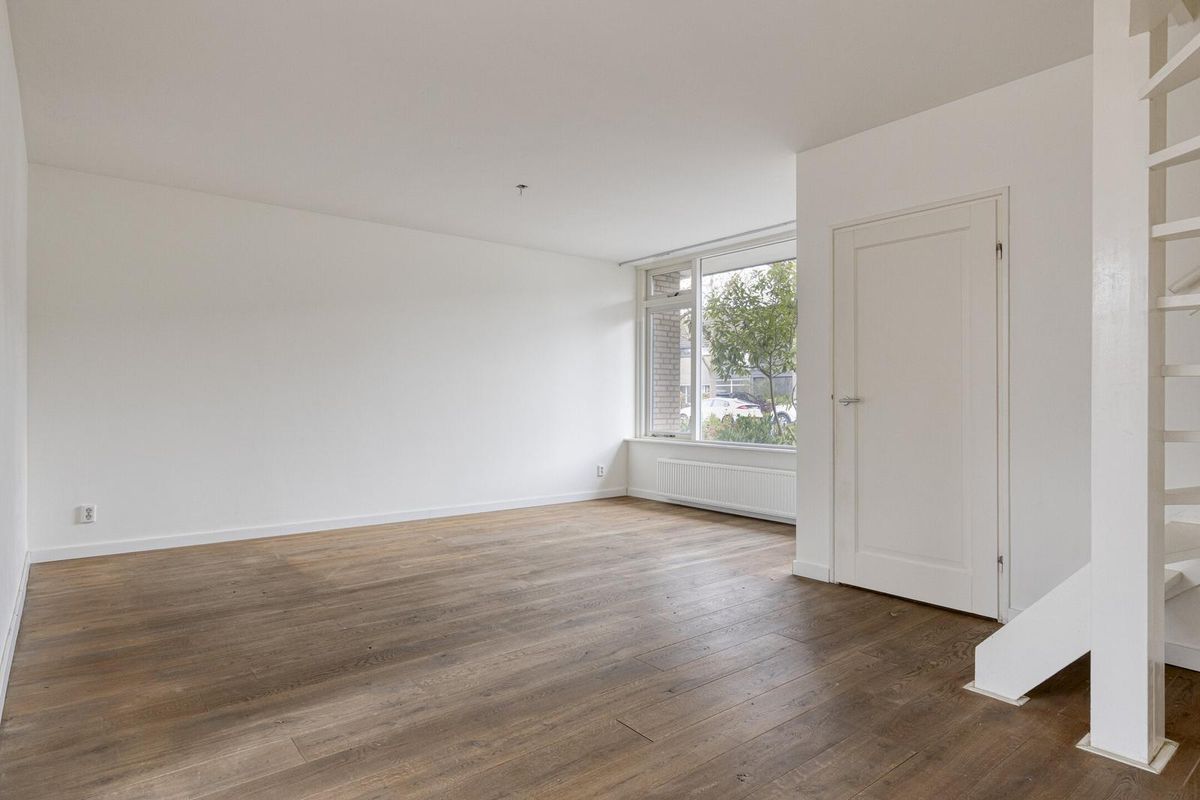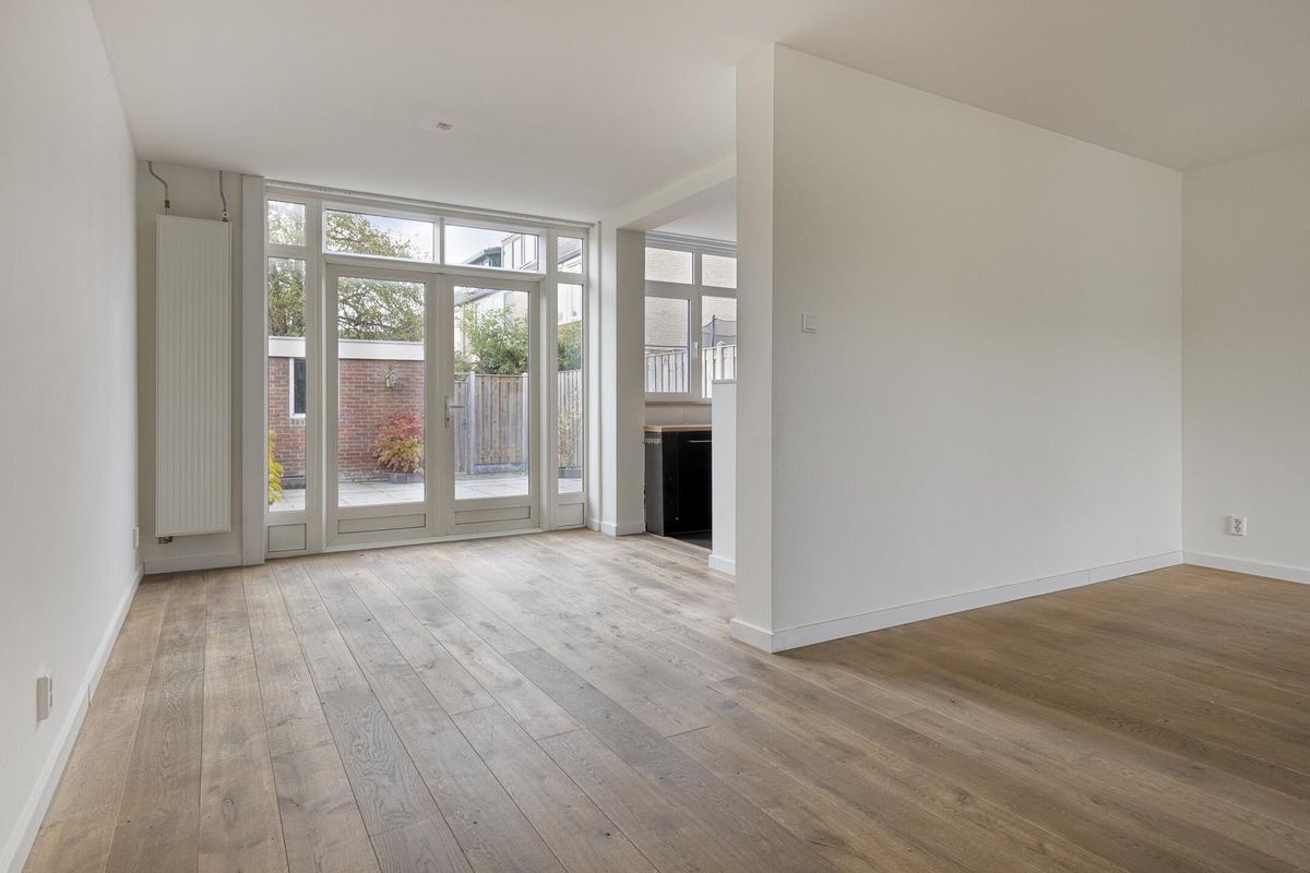 De ruime woonkamer is voorzien van een houten vloer, openslaande deuren naar de achtertuin en een trapopgang naar de eerste verdieping.