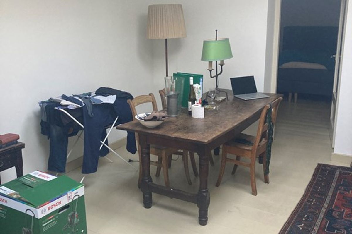 In de woonkamer staat momenteel een grote eettafel met vier stoelen waar in huiselijke sfeer heerlijk gegeten kan worden.
