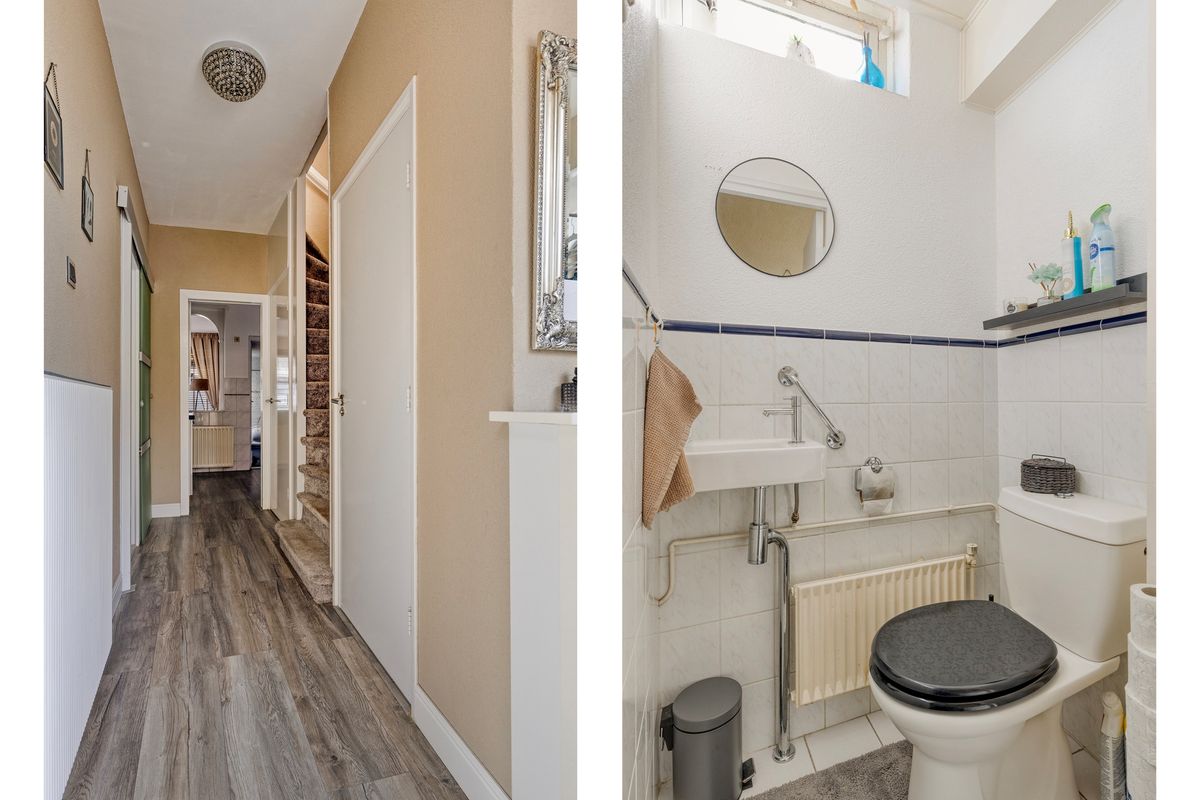 Via de entree kom je in de hal met trapkast, meterkast en trapopgang naar de eerste verdieping. Ook bevindt zich hier een eenvoudige toiletruimte. De sfeervolle uitgebouwde woonkamer is voorzien van een lichtkoepel en schuifpui naar de tuin. De dichte keuken is uitgerust met diverse inbouwapparatuur, waaronder een 5-pits gaskookplaat, combi-magnetron, koelkast, vaatwasser en afzuigkap. Aansluitend vind je de bijkeuken met wastafel, wasmachineaansluiting en opstelplaats voor de HR combi-ketel.