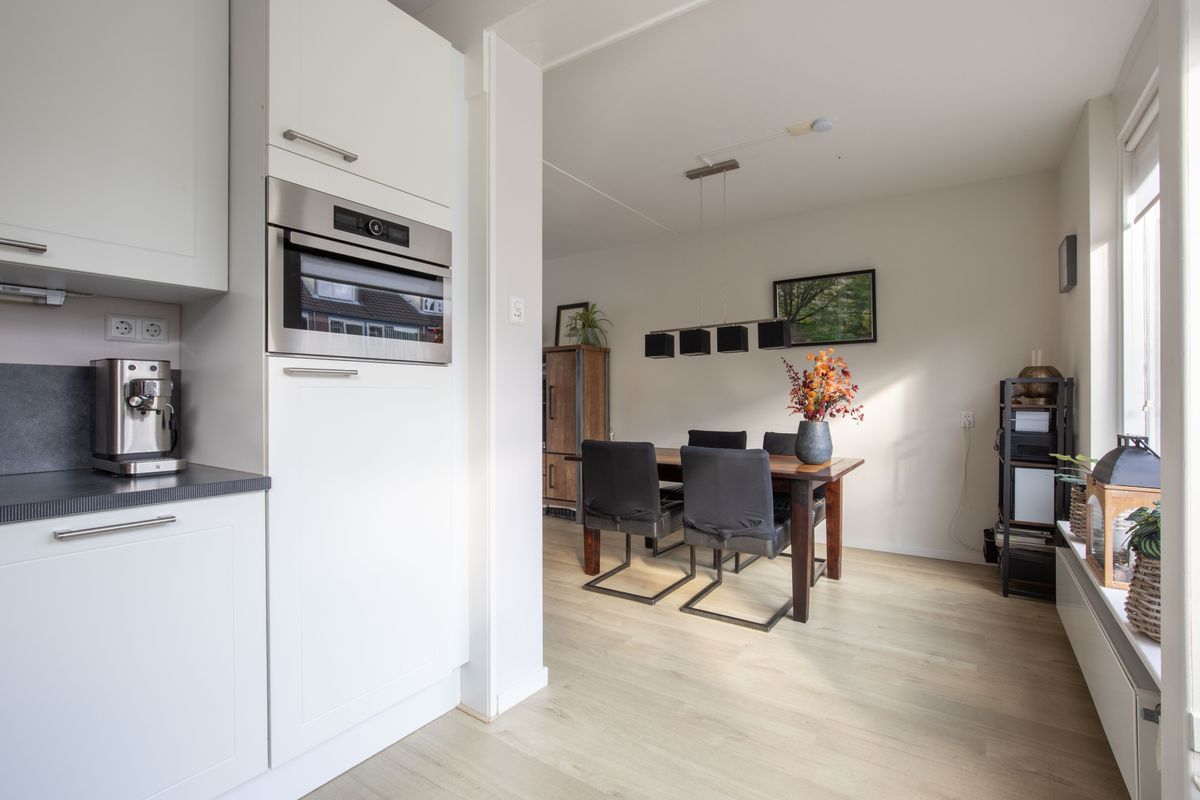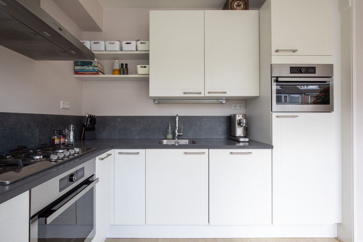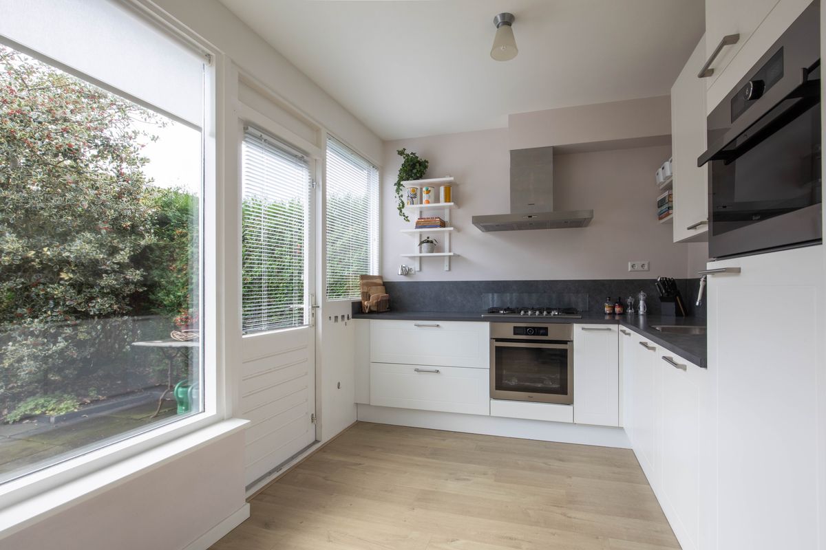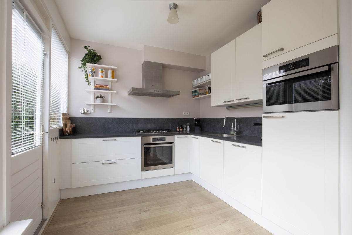 Aan de achterzijde bevindt zich de open keuken (vernieuwd in 2016), uitgerust met een 4-pits gaskookplaat, een afzuigkap, een oven, een combi magnetron, een vaatwasser en een koelkast. Vanuit de keuken is er toegang tot de achtertuin. De woonkamer en keuken zijn voorzien van een fraaie laminaatvloer.