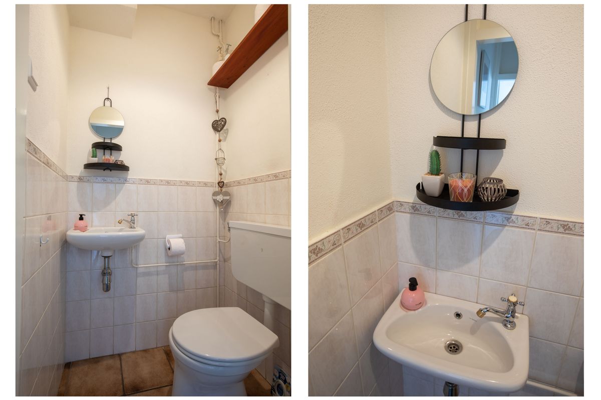 De badkamer is netjes afgewerkt en voorzien van een douche, toilet en wastafel met meubel. De ruimte is geheel betegeld en heeft een natuurlijke lichtinval.