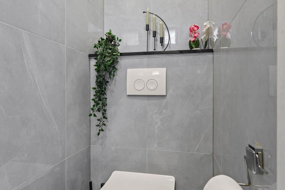 -Toilet: Het toilet is modern uitgevoerd en volledig betegeld in een lichte, stijlvolle tint. De ruimte is voorzien van een hangend toilet, een strak afgewerkte nis voor decoratie en een frisse, nette uitstraling.