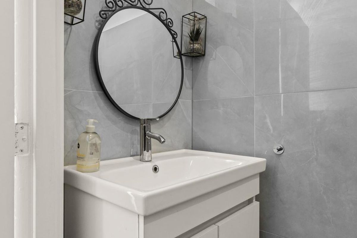 -Badkamer: De badkamer is volledig betegeld met grote grijze tegels, wat zorgt voor een strak en modern geheel. De zwarte glazen douchewand en luxe inloopdouche geven een stijlvolle uitstraling, terwijl de witte wastafel met opbergruimte en designradiator zorgen voor een nette en verzorgde afwerking.