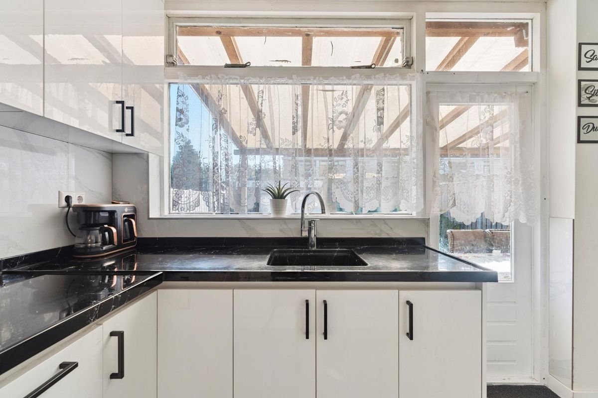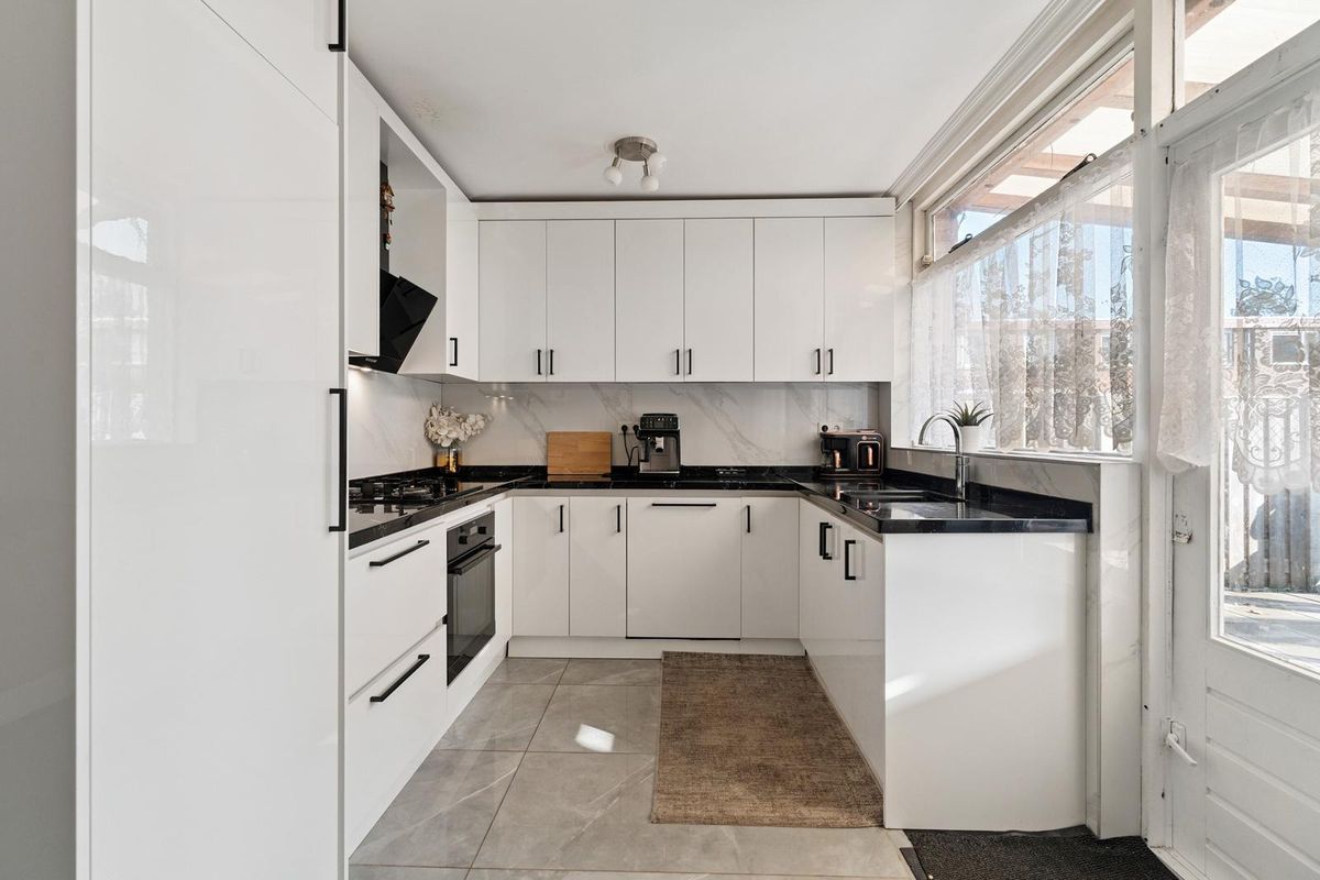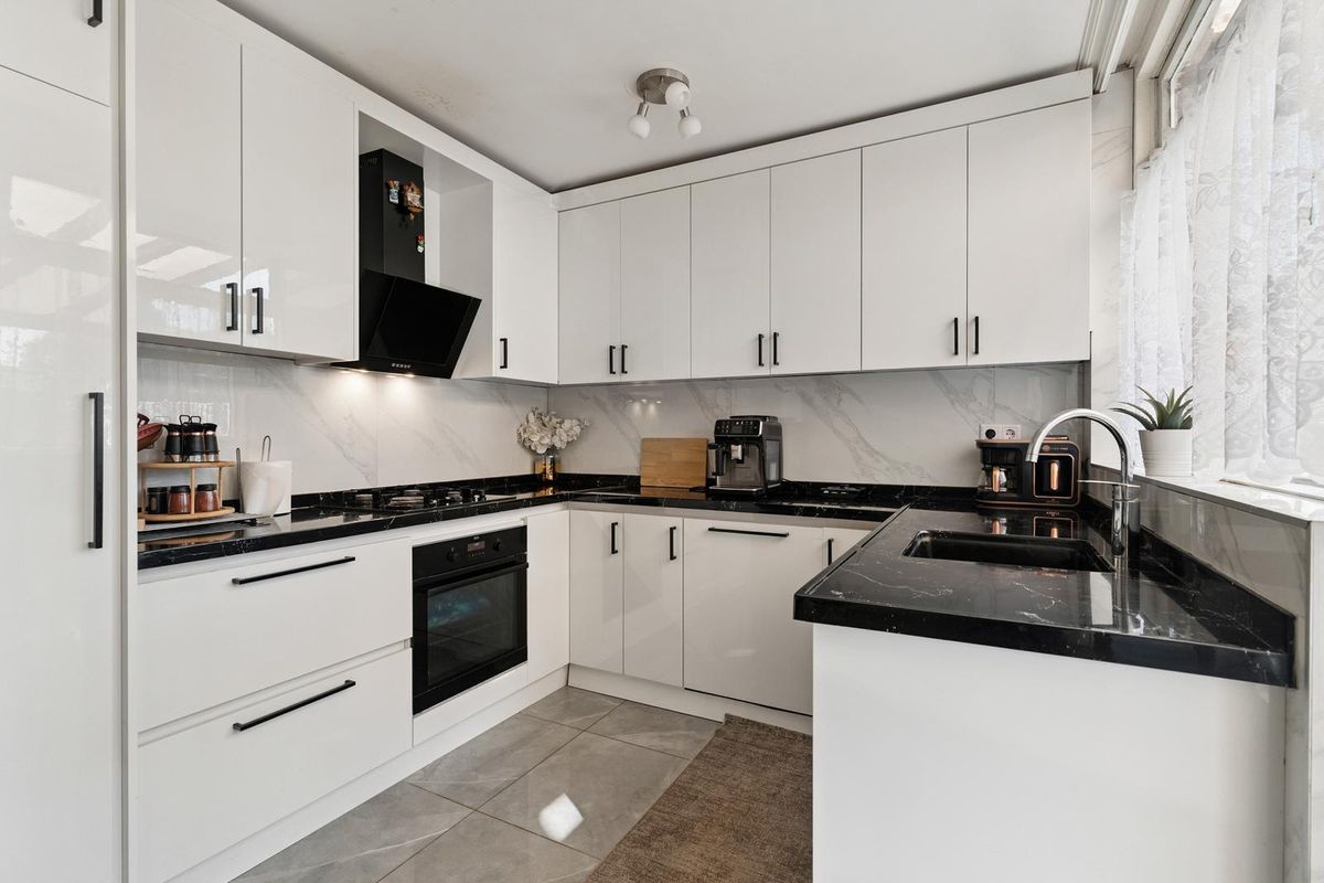 - Keuken: De moderne open keuken is uitgevoerd in een strakke U-opstelling met hoogglans witte kasten en een donker werkblad. De ruimte is voorzien van een nette tegelvloer en grote ramen waardoor er veel daglicht binnenkomt.