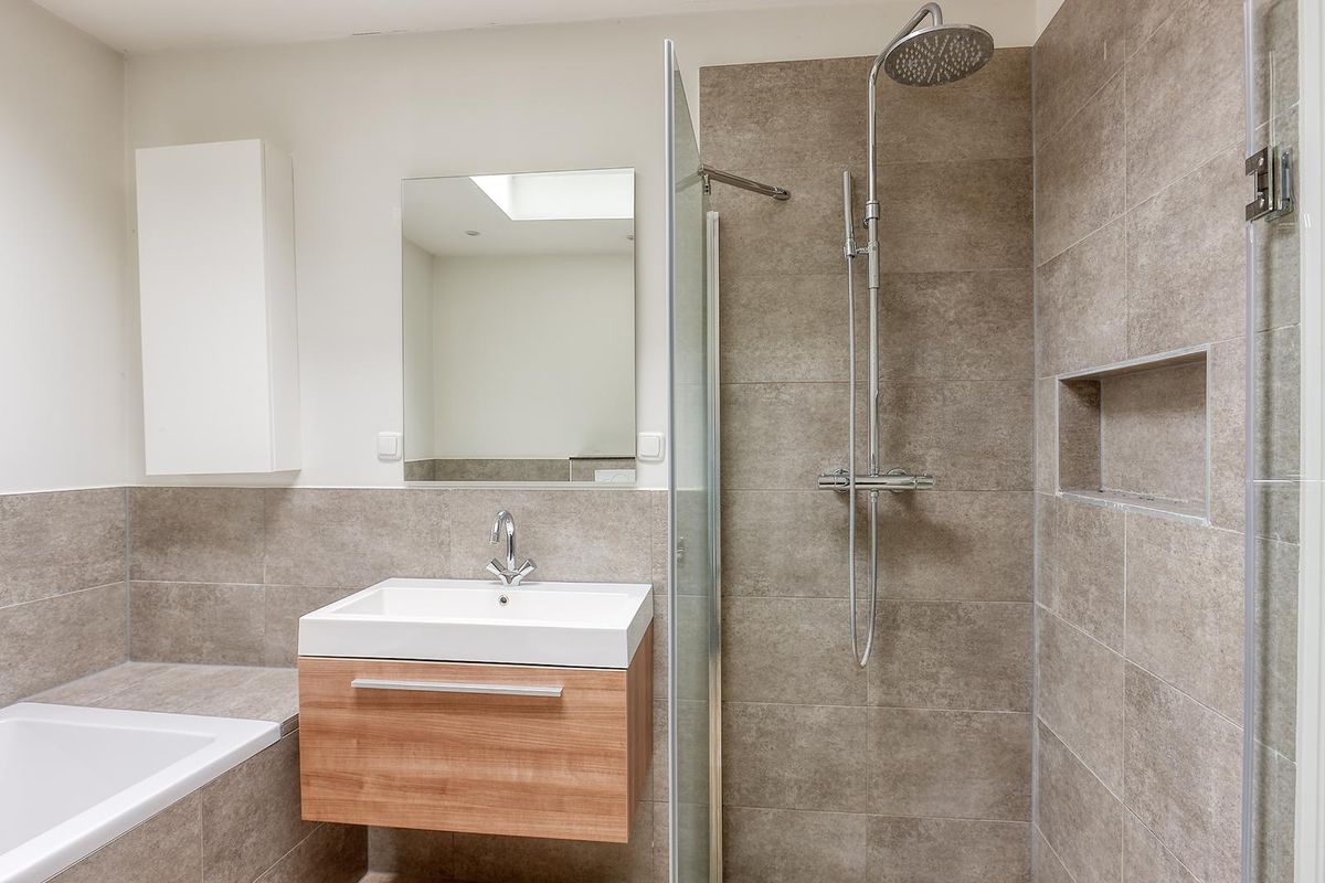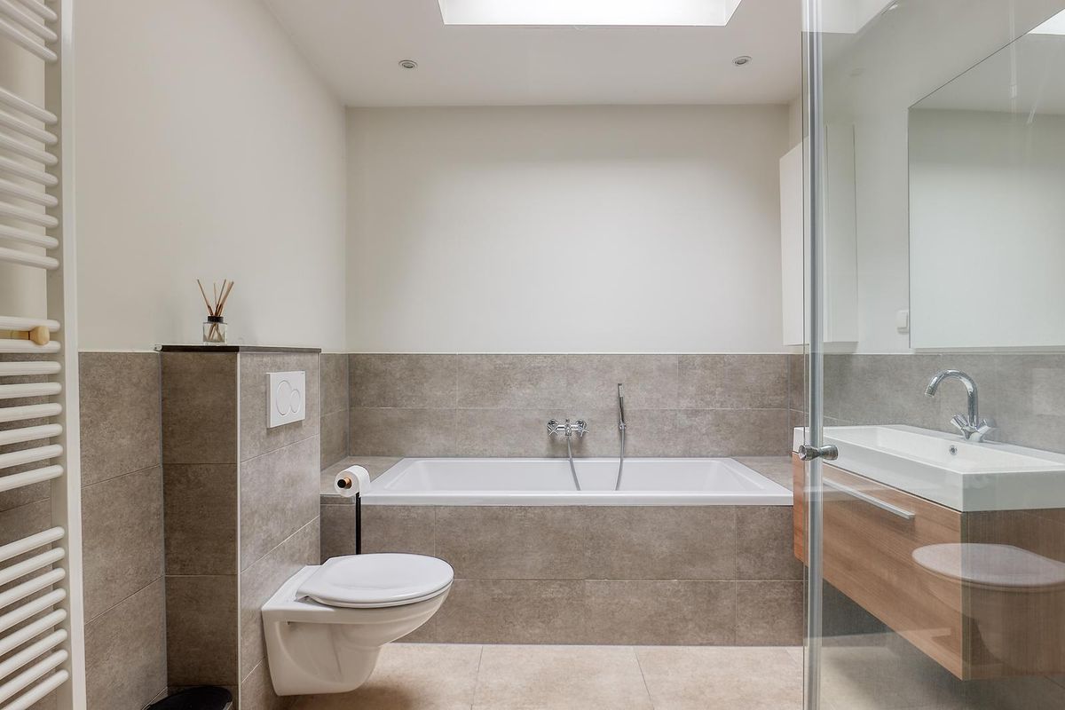 Aan de achterzijde van de woning bevindt zich de master bedroom met een royale ensuite badkamer uitgerust met een ligbad, inloopdouche, toilet en dubbele wastafel met meubel. Via een tweede gang bereik je de tweede slaapkamer. Deze gang biedt tevens toegang tot een separaat toilet met fonteintje, een tweede badkamer voorzien van een douche, wastafelmeubel en handdoekradiator, én een praktische kast met aansluitingen voor wasmachine en droger.