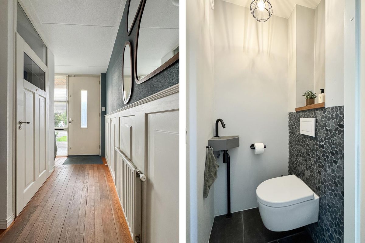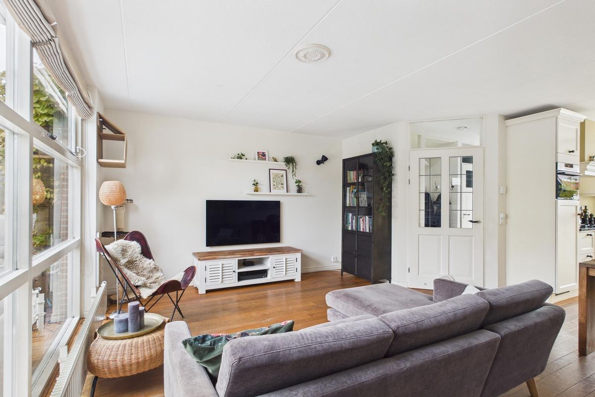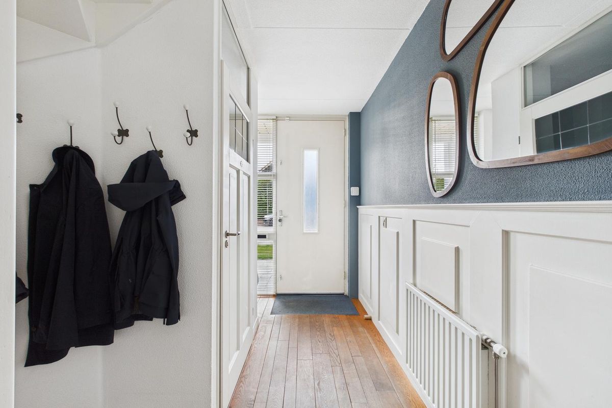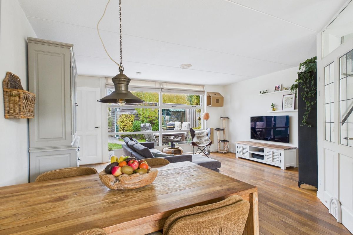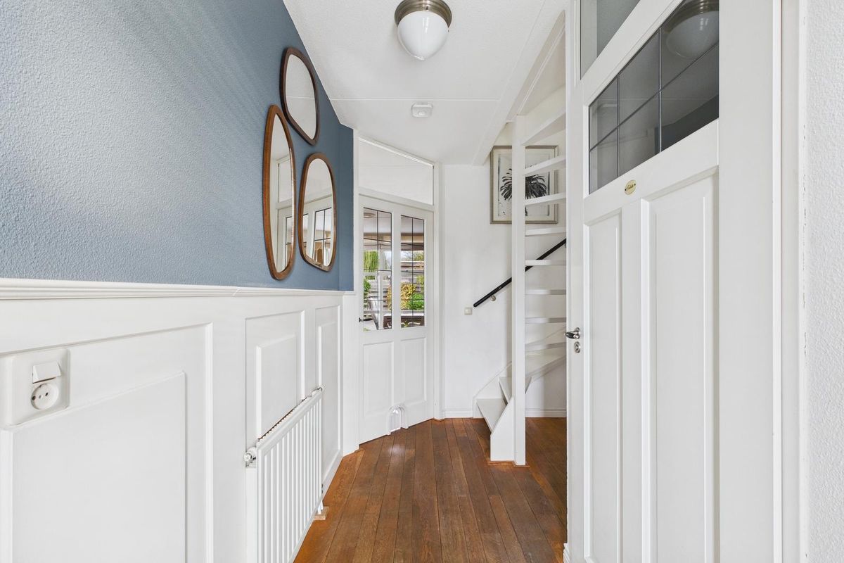 Entree met ruime hal, meterkast, modern toilet (vernieuwd in 2024), open trap en voldoende plek voor de garderobe. De woonkamer is licht en ruim (ca. 25 m²) dankzij de grote glazen pui met zicht op de achtertuin. Aan de voorzijde bevindt zich de open keuken in witte hoekopstelling, voorzien van gasfornuis met oven, afzuigkap, vaatwasser, koelkast en combimagnetron. Achter in de woonkamer is een tochtportaal met tuindeur naar het terras.