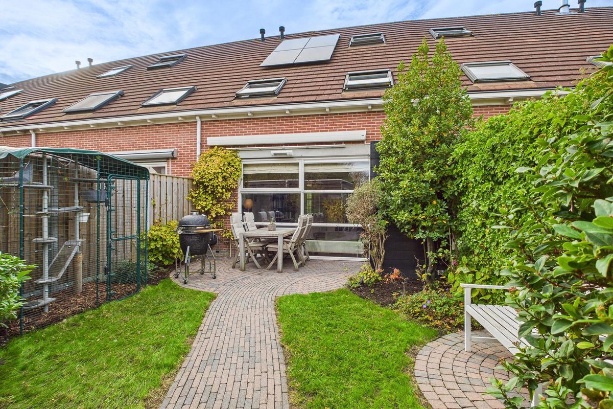 De achtertuin ligt op het oosten en is verzorgd aangelegd met een terras, achterom en een stenen berging (7 m²). Aan de achterzijde is bovendien een zonnescherm geplaatst. Aan de voorzijde is er volop openbare parkeergelegenheid direct voor de deur.