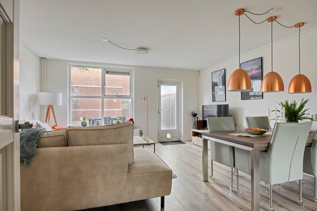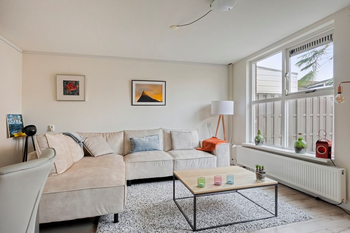 De lichte woonkamer biedt uitzicht op de tuin en is voorzien van een nette laminaatvloer.