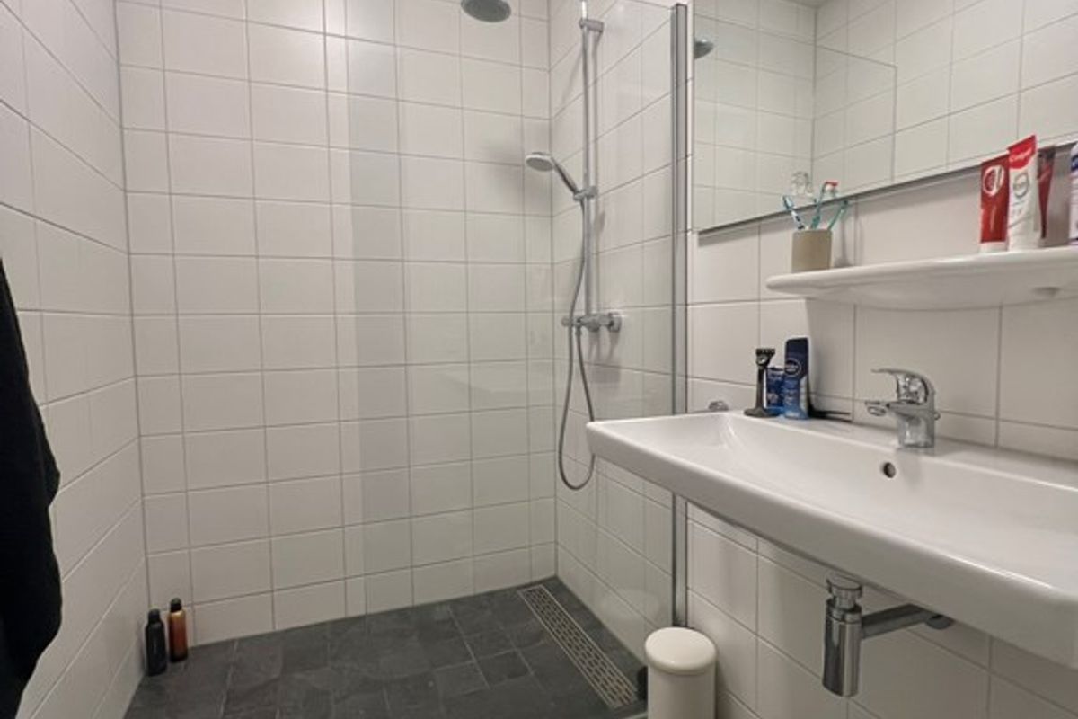 De badkamer is voorzien van een douche, wastafelmeubel met spiegel en een handdoekenradiator.