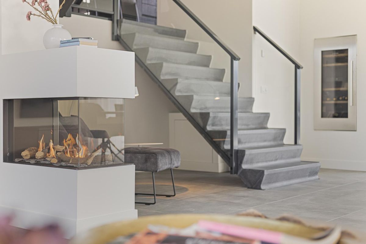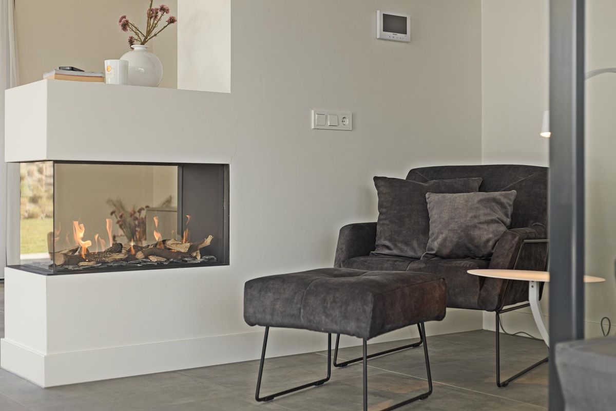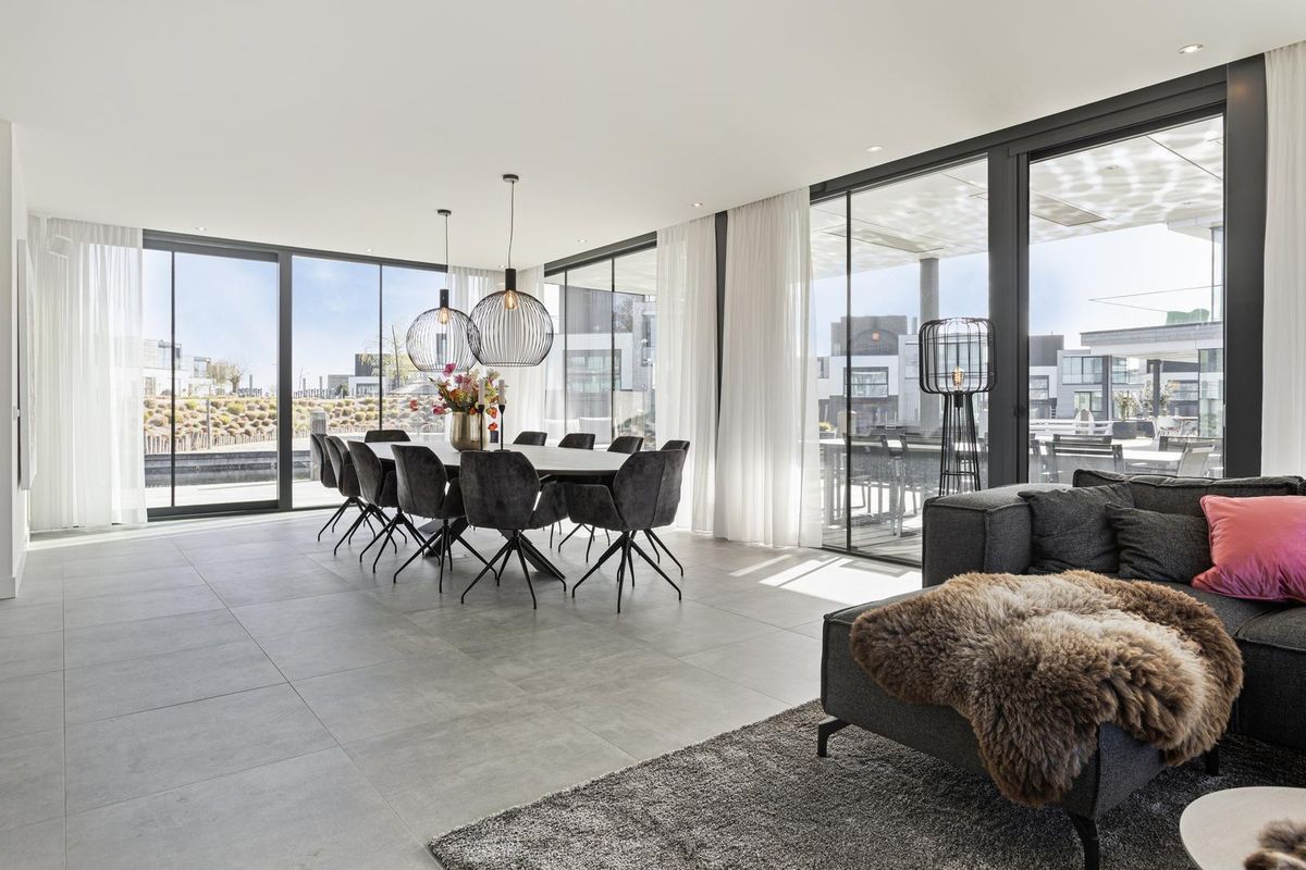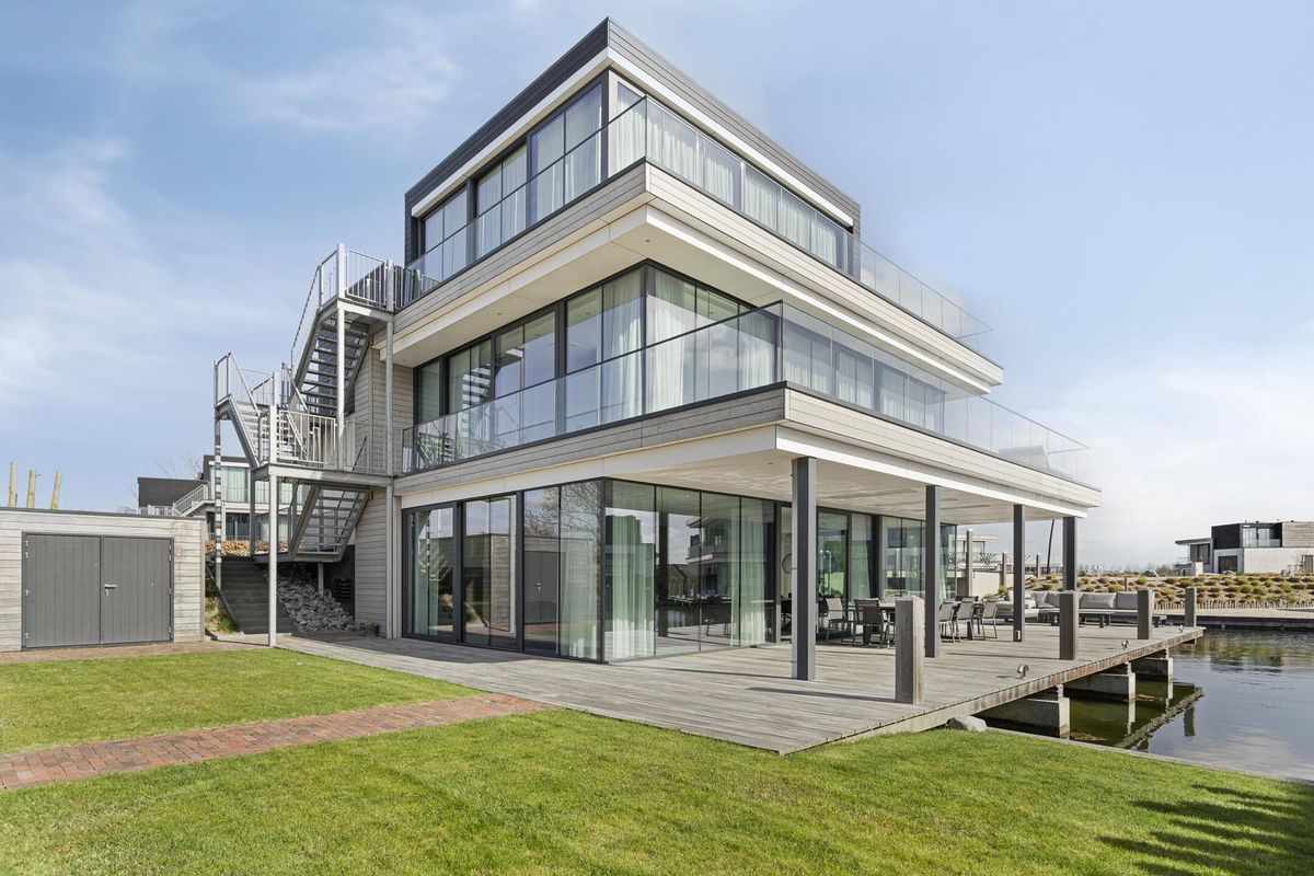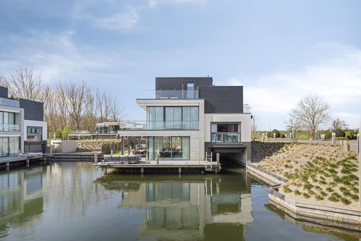 De sfeervolle living biedt een royale zithoek met haard en een op maat gemaakte eettafel voor twaalf personen. De wijnklimaatkast staat al klaar voor gezellige avonden. Via de schuifpui bereikt u het overdekte terras met heaters en de royale terras-steiger: een plek om te loungen, te dineren of direct een duik te nemen via de zwemtrap. Ook is er een buitendouche, extra berging en toegang tot het inpandige boothuis. Aan de andere kant van de villa ligt een zonnige tuin met terras, loungehoek en een geïsoleerde berging in de stijl van de villa, perfect voor fietsen, supboards of tuinmeubilair.