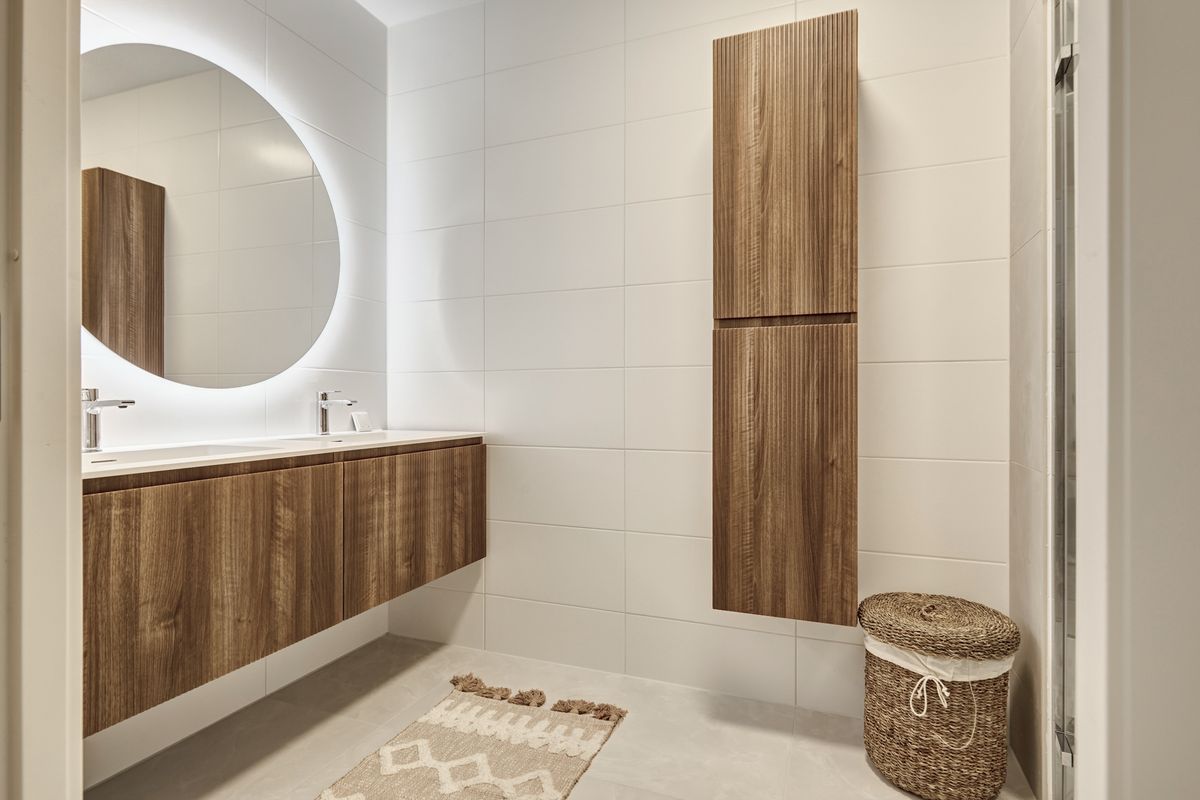 Rechts de moderne badkamer met inloop-douche en dubbel wastafel met meubel.