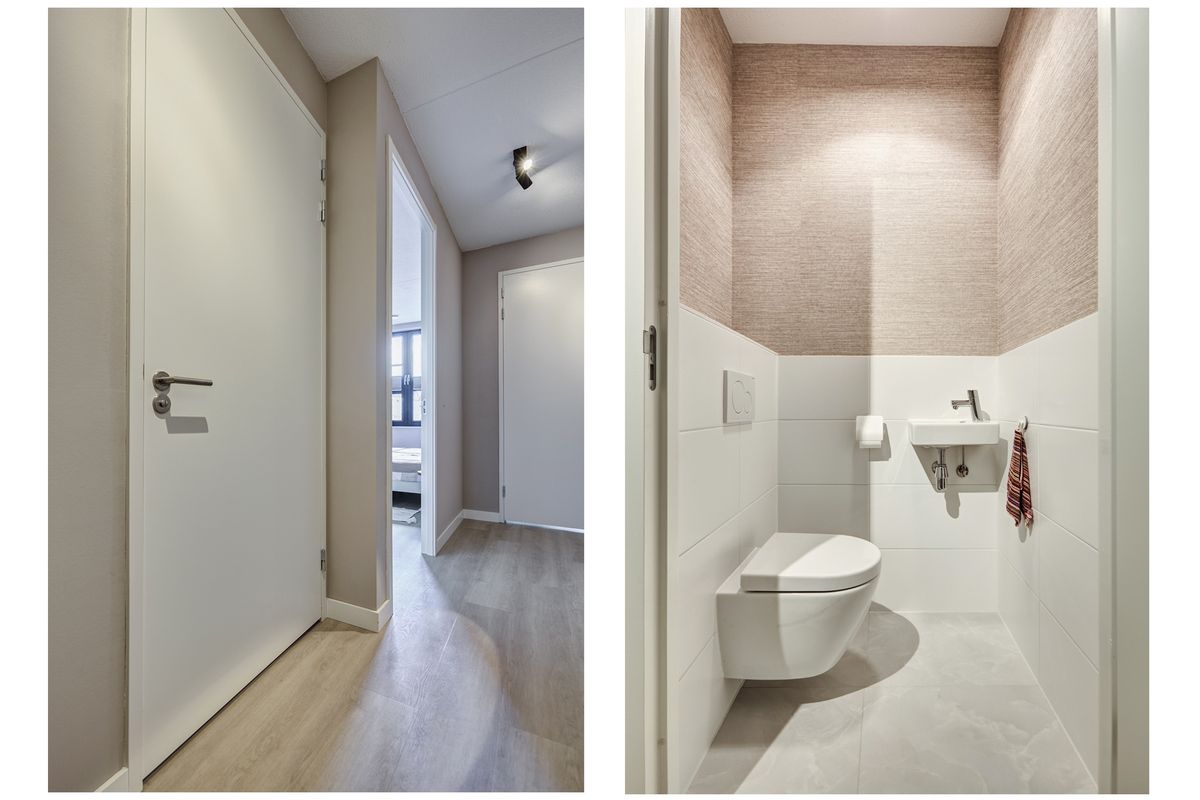 On the left a separate toilet with sink and then the master bedroom with large corner cupboard and Auping bed.