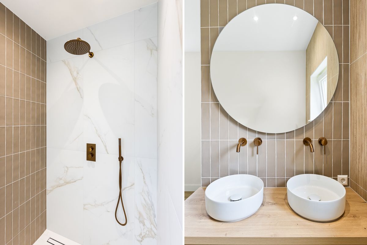 overloop met houten vloerdelen en sfeervolle toiletruimte. Tweede badkamer voorzien van elektrische vloerverwarming, luxe inloopdouche met hand- en regendouche en een wastafel met meubel. 3 Slaapkamers (ca. 16 m², ca. 10 m² en ca. 11 m²) waarvan de kamer aan de voorzijde is voorzien van vaste kastruimte en houten vloerdelen en één kamer is voorzien van een pvc vloer met wasmachine- en drogeraansluiting en opstelling van de warmtepomp. Deze laatste kamer zou dienst kunnen doen als logeerkamer, kantoor en-/of kledingkamer. Vanuit deze kamer is er ook toegang tot het platte dak.