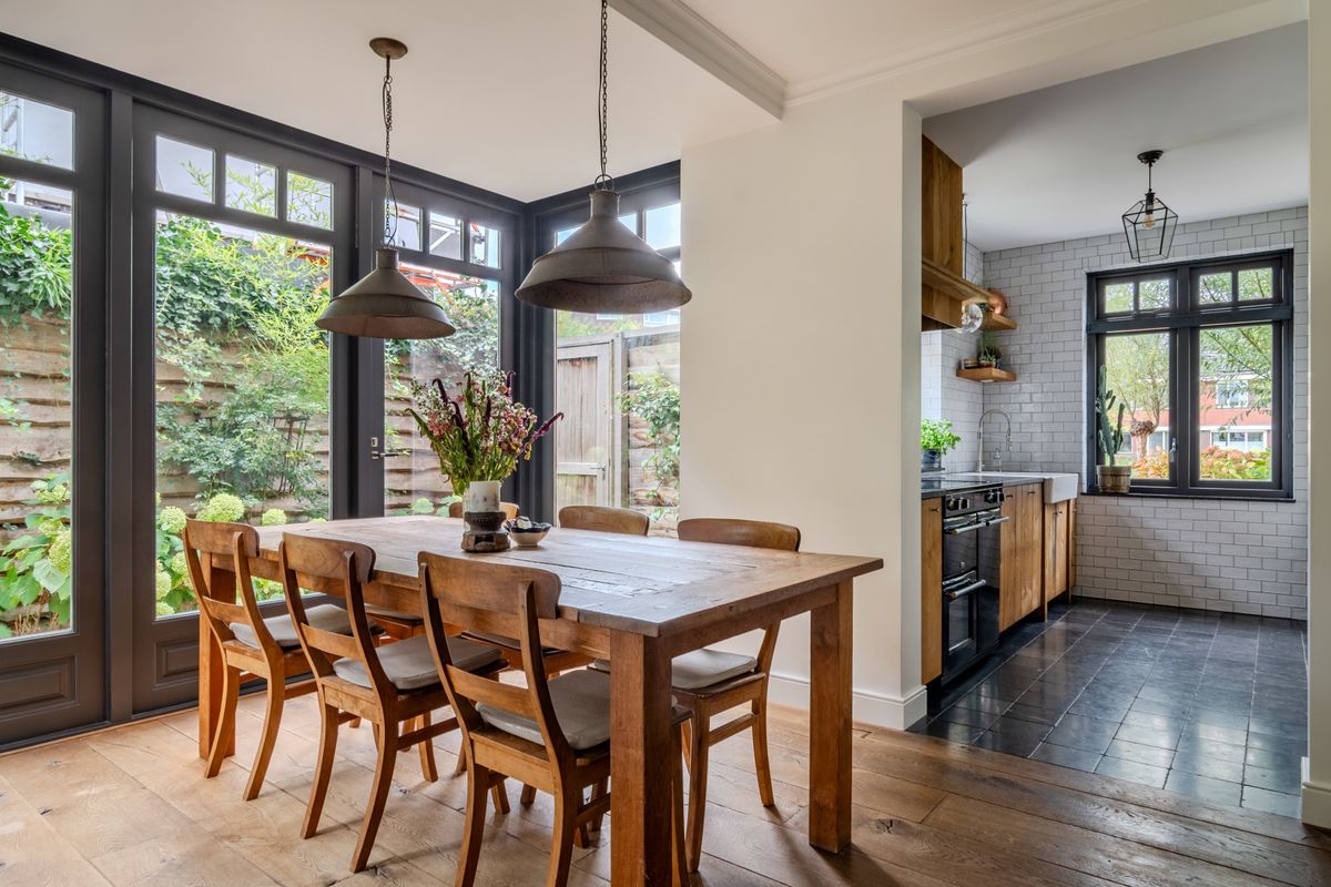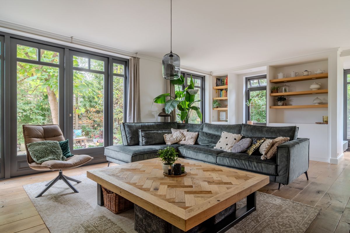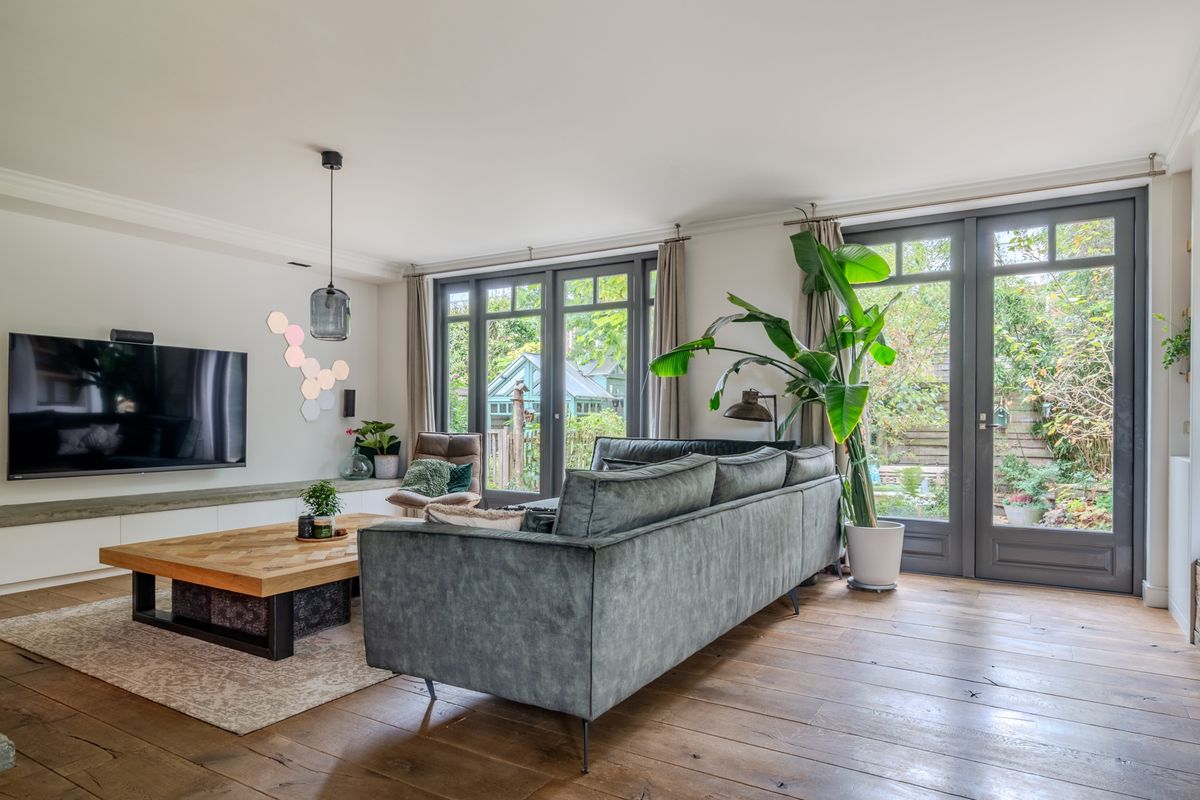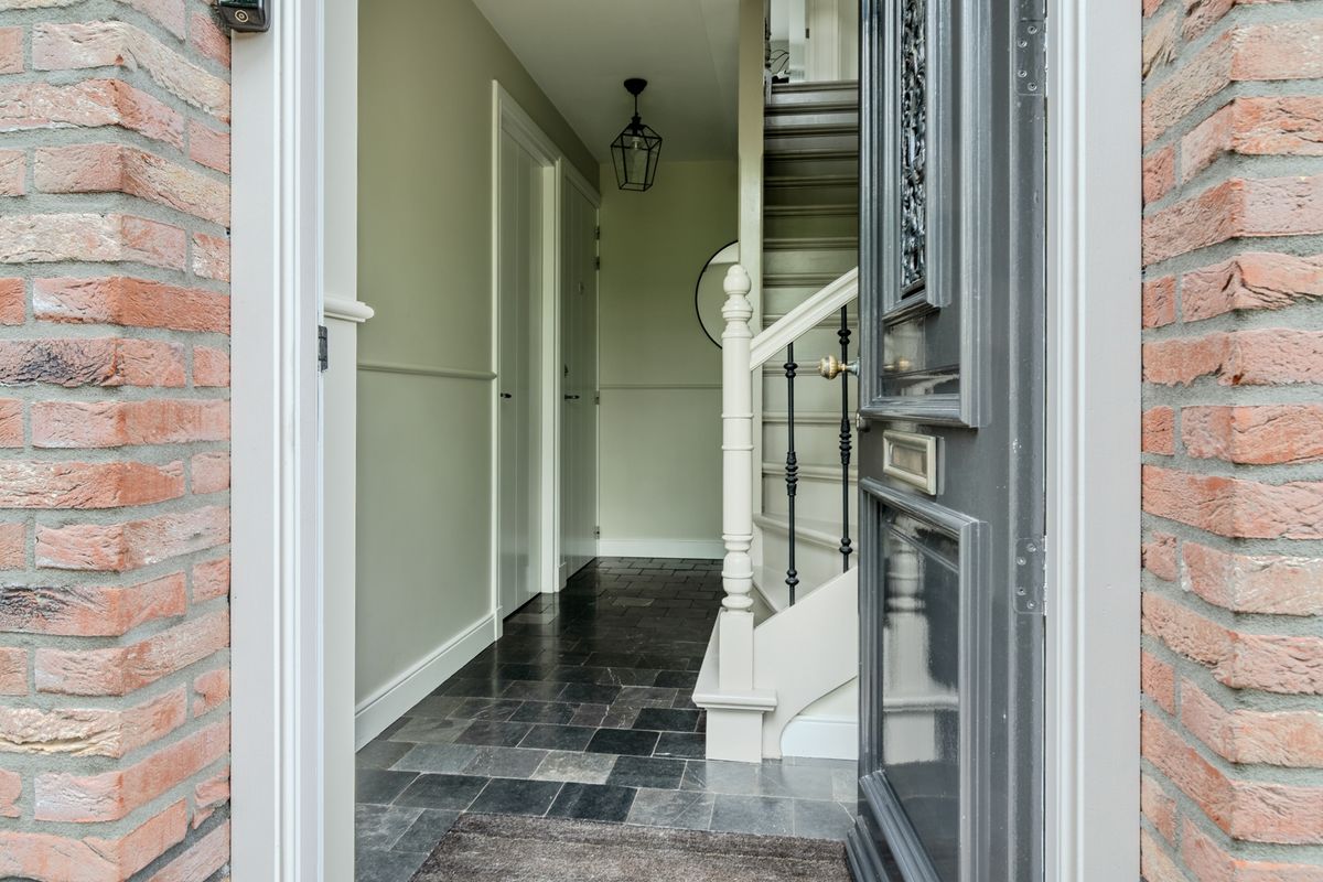 Binnenkomst in de hal met meterkast en trapopgang naar de eerste verdieping. De hal geeft toegang tot de werkkamer, het toilet en de living. De werkkamer (3.32 x 2.40) met handige inbouwkast is aan de voorzijde gesitueerd. Vanuit hier heb je toegang tot de extra grote garage (6.80 x 3.19) met elektrische deur. Het toilet is voorzien van een wandcloset en wastafel. De living (7.21 x 5.13) is geweldig! Hier zijn alle woonwensen gerealiseerd van vaste kasten, kachel, ruimte voor grote meubelen tot op twee plaatsen dubbele deuren. Deze geven je het ultieme binnen-buiten gevoel. Ook in de eetkamer (4.47 x 3.26) krijg je datzelfde gevoel, want ook hier heb je de mogelijkheid om de dubbele deuren open te zetten op een mooie zomerse dag. De half open keuken (3.22 x 2.62) past perfect in het hele plaatje met een hardstenen werkblad en de houten afwerking van de kastruimte. Uiteraard is de keuken voorzien van diverse inbouwapparatuur. Tijdens het koken kijk je hier heerlijk uit over de singel.