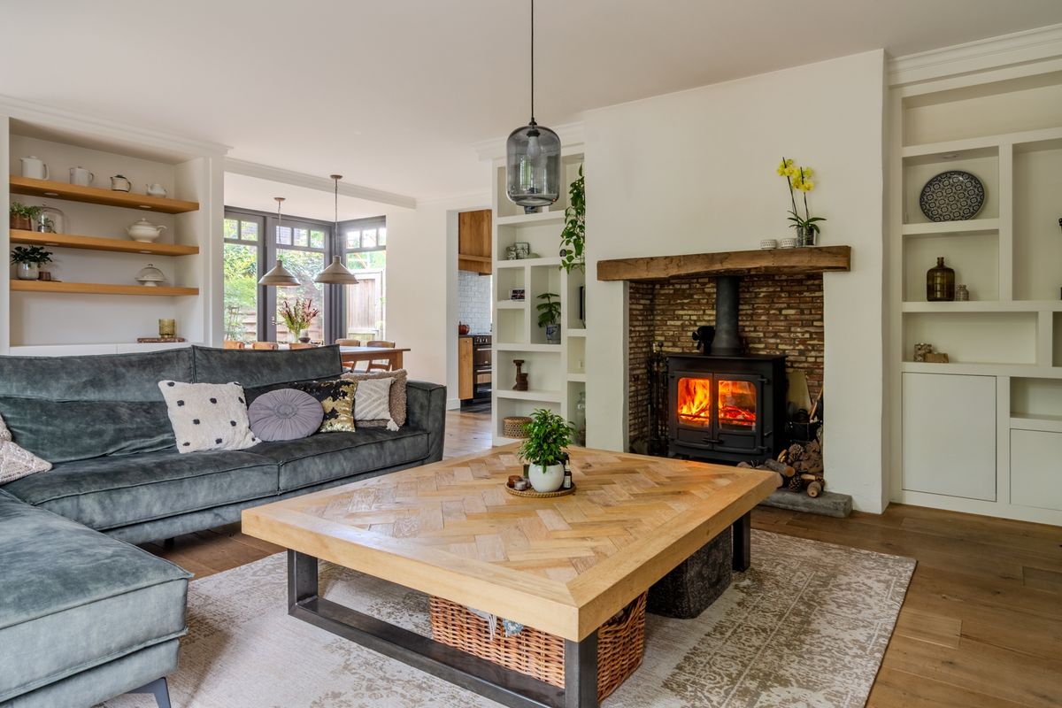 * CV houtkachel Nordic Fire Carvaille die de radiatoren en vloerverwarming verwarmt, bouwjaar 2010 (eigendom)