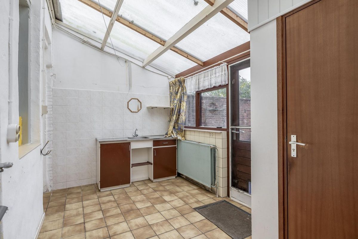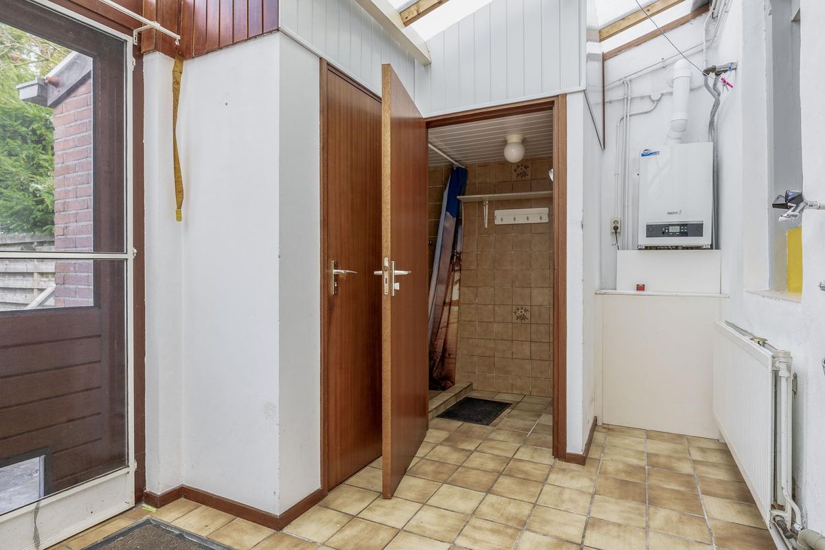 Begane grond: entree met meterkast en toegang tot de ruime L-vormige woonkamer. Achter de woonkamer ligt de woonkeuken met een eenvoudig keukenblok in hoekopstelling. Vanuit hier is er toegang tot een tussenhalletje met trap naar de verdieping en trapkast. Achter de keuken bevindt zich de bijkeuken met toilet en een douchehoek.