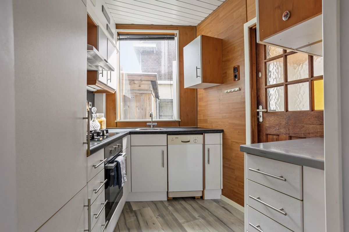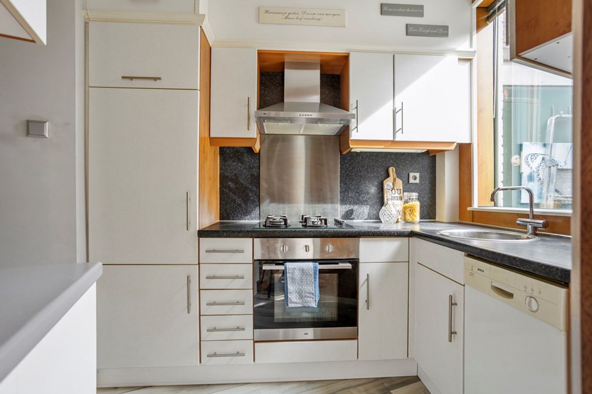 De keuken is voorzien van diverse inbouwapparatuur zoals een 4-pits gaskookplaat, afzuigkap, koel-vriescombinatie en vaatwasser en biedt toegang tot de bijkeuken. De bijkeuken is later aangebouwd en voorzien van een wasmachineaansluiting. Ook is er toegang tot de ruime kelder van ca. 27 m2. Ideaal voor de hobbyist. Hier bevindt zich ook de CV-ketel. De achtertuin met ligging op het zuidoosten is voorzien van een ruime berging van ca. 11 m2 en aparte toegangsdeur. Ideaal voor bijvoorbeeld de motorliefhebber.