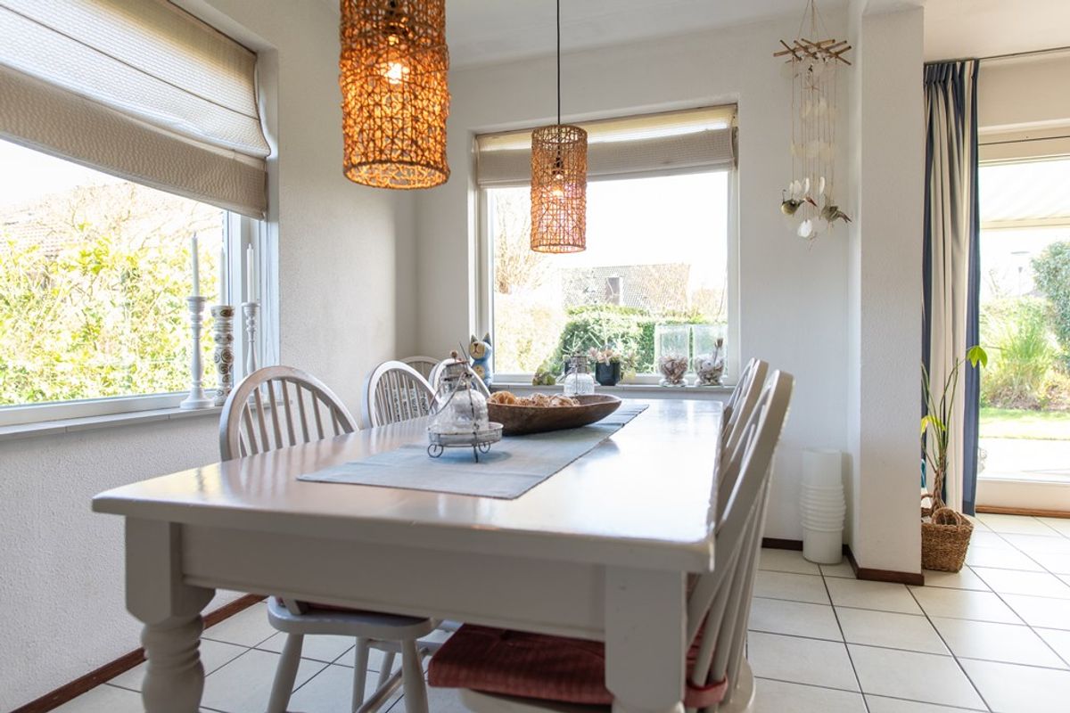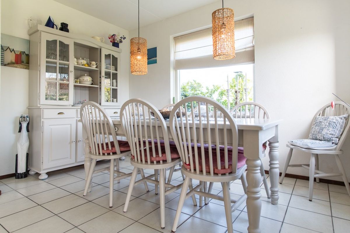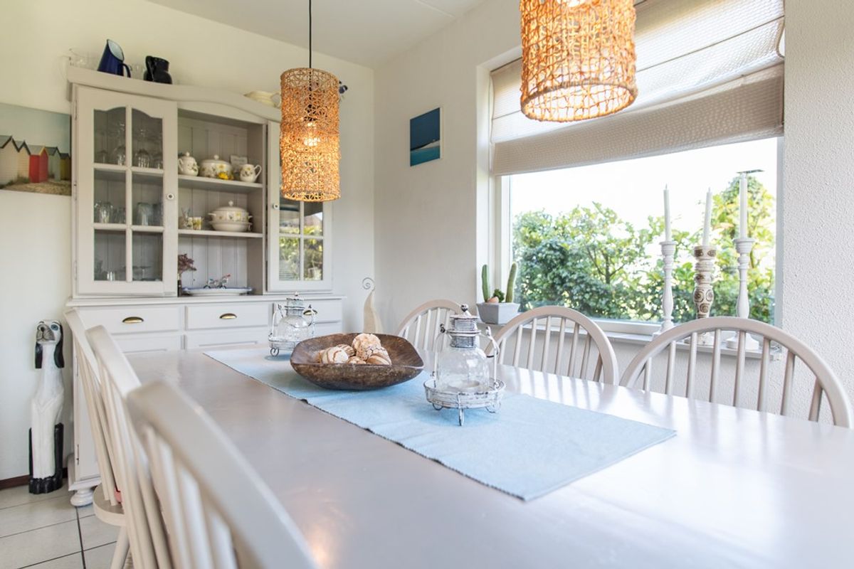 De open keuken in hoekopstelling is voorzien van een 4-pits gaskookplaat, afzuigkap en spoelbak. Aansluitend bevindt zich een ruime bijkeuken met koel-/vriescombinatie, magnetron, wasmachine en vaatwasser. Deze ruimte biedt tevens volop bergruimte en heeft een achterdeur – ideaal na een dag strand.