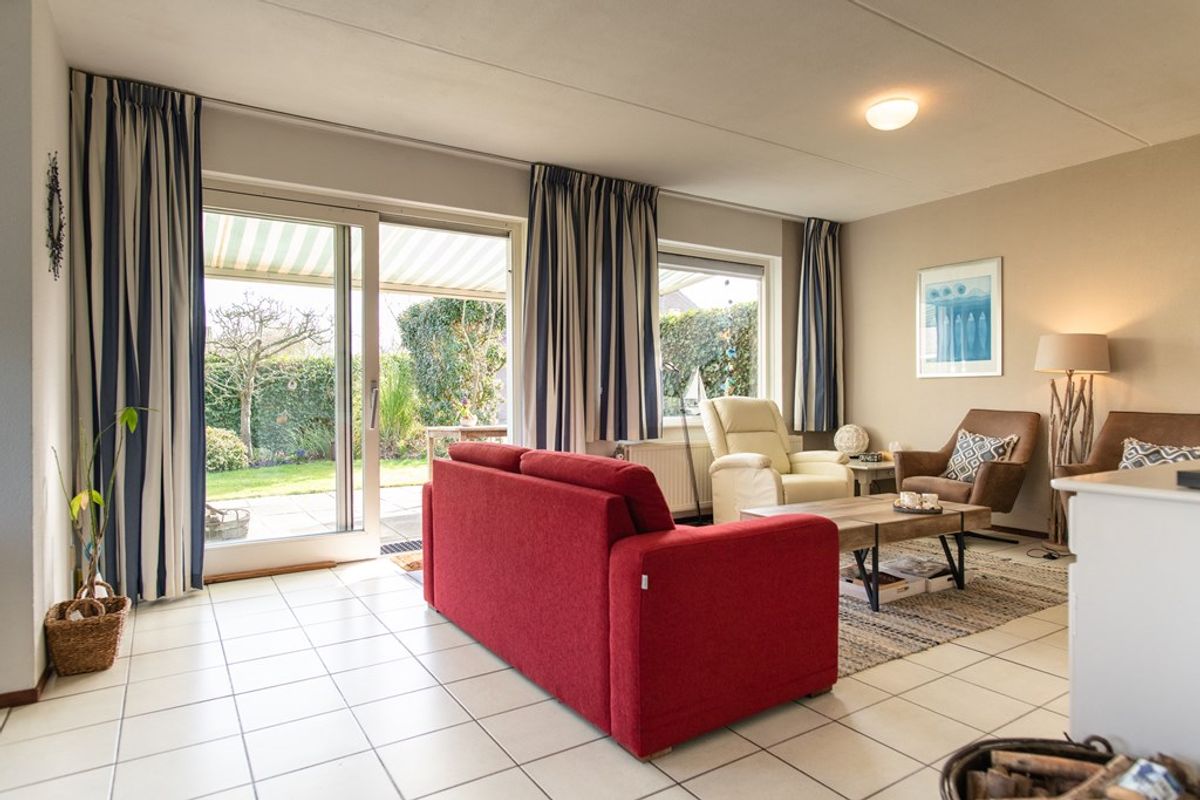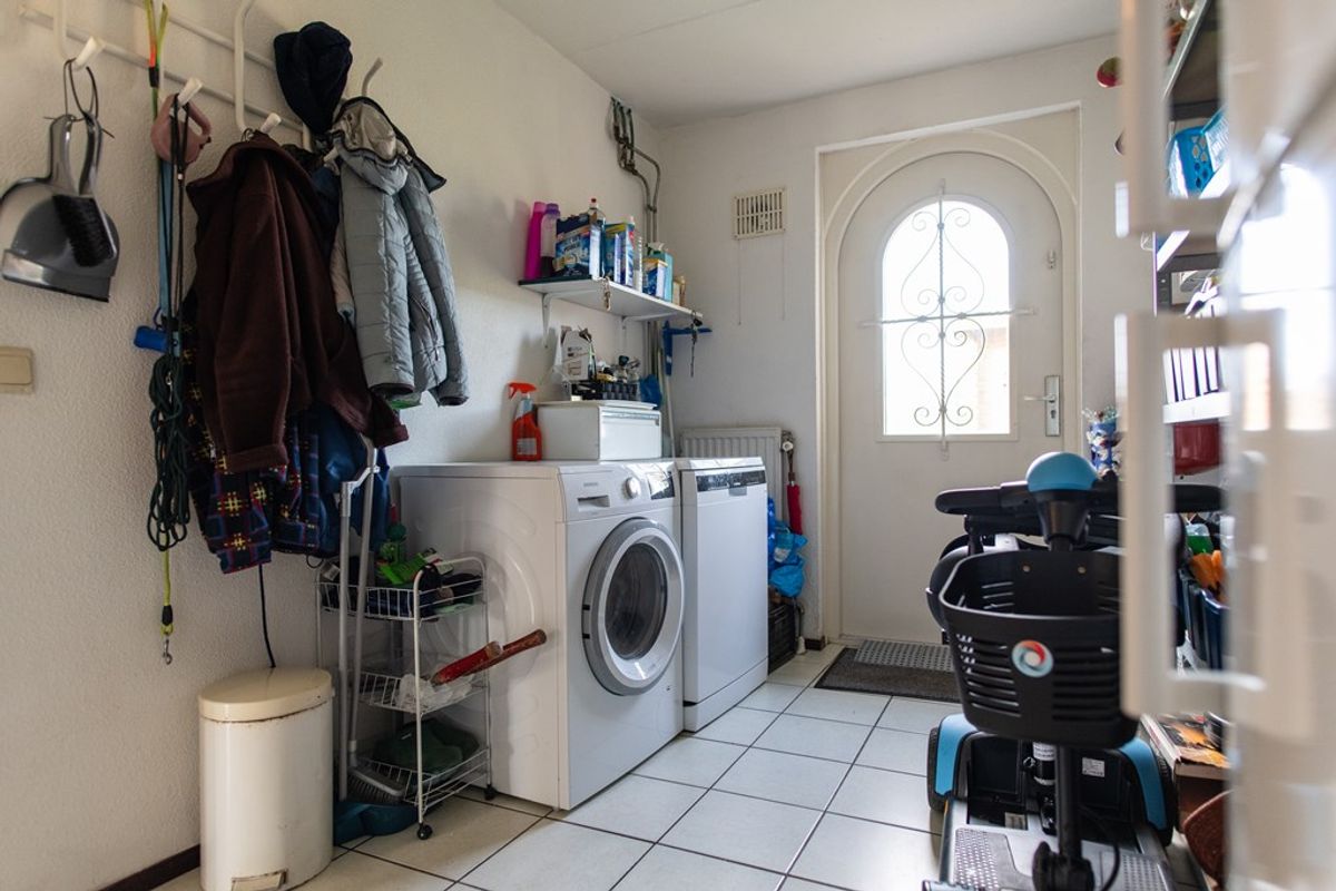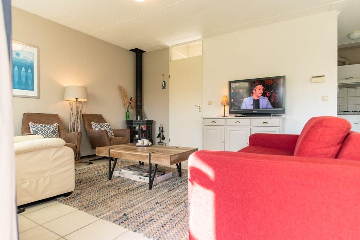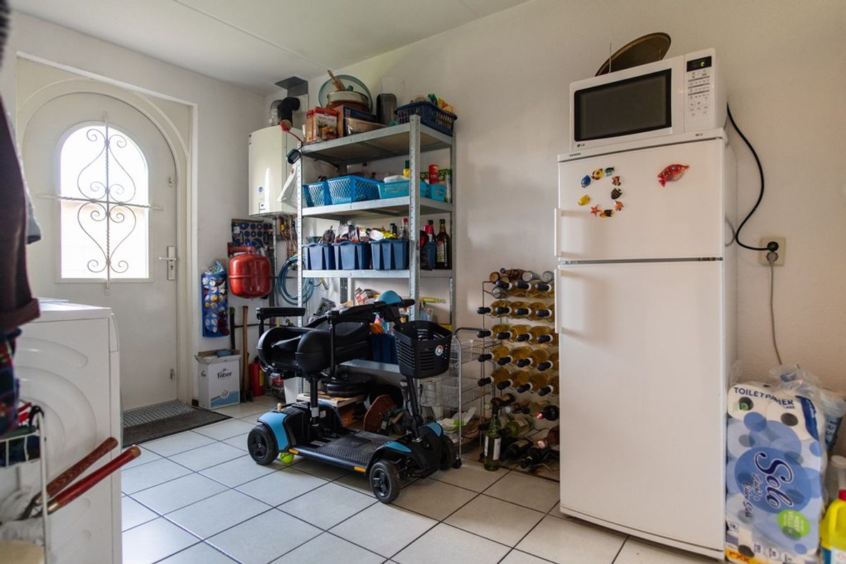 De open keuken in hoekopstelling is voorzien van een 4-pits gaskookplaat, afzuigkap en spoelbak. Aansluitend bevindt zich een ruime bijkeuken met koel-/vriescombinatie, magnetron, wasmachine en vaatwasser. Deze ruimte biedt tevens volop bergruimte en heeft een achterdeur – ideaal na een dag strand.