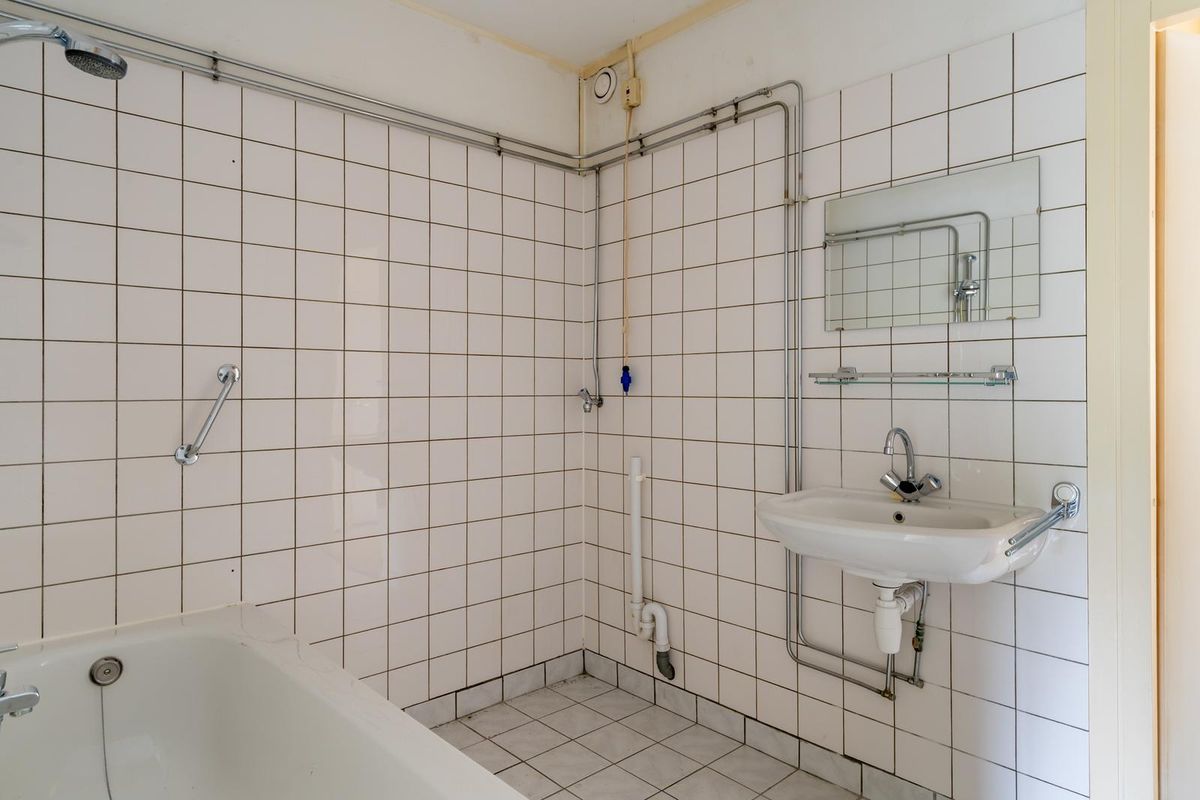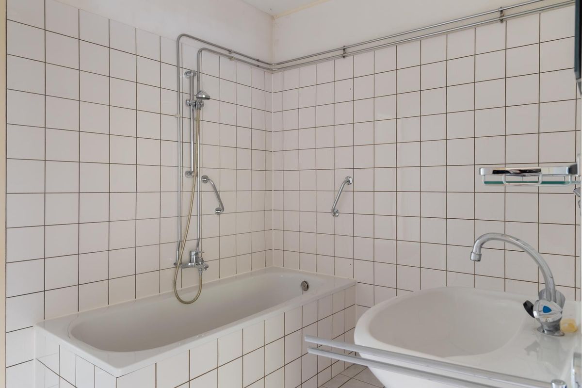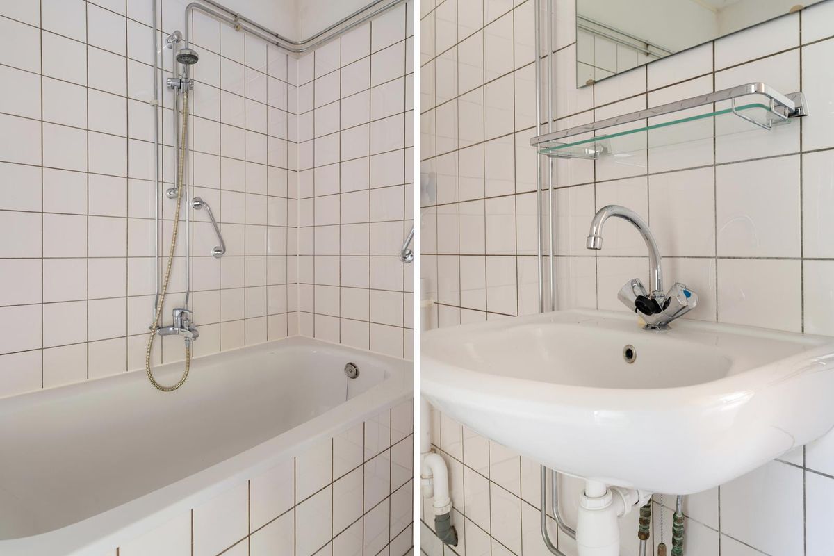 - nette eenvoudige badkamer met ligbad en wastafel.