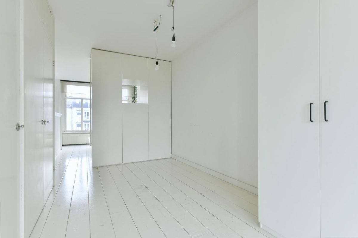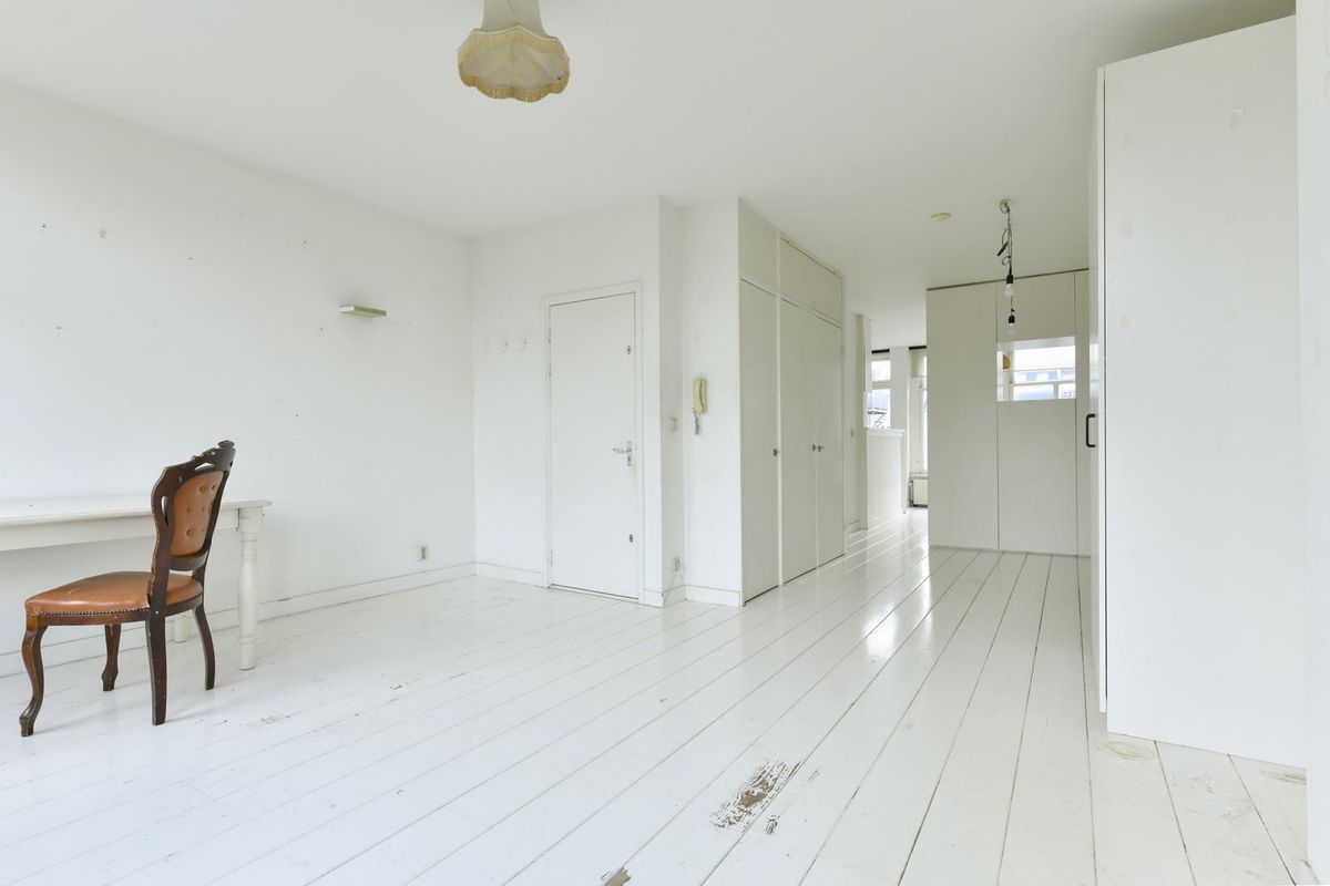 This is the top floor apartment, so you have no upstairs neighbors (!) and only storage space in the attic. Upon entering, we step right into the middle of the house. The entire floor is laid with white-painted wood in wide strips. Thanks to the bright light incidence and the view of the canals with their typical Amsterdam buildings, coming home to this cozy apartment always feels like a warm welcome.