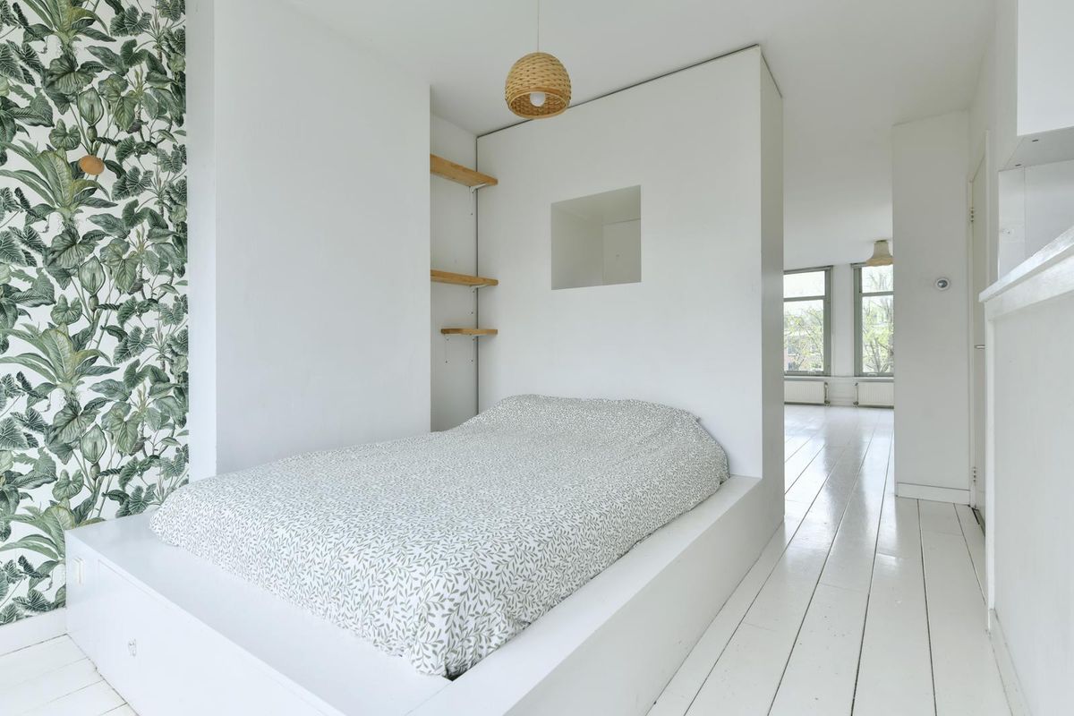 De slaapkamer is te vinden aan de achterzijde van het pand. Deze biedt voldoende plek voor een tweepersoonsbed en een kledingkast is handig gepositioneerd als afscheiding van de woonkamer. Indien gewenst is het makkelijk om een vaste deur te creëren, zodat de slaapkamer afgesloten kan worden. Wandschappen zijn bevestigd aan de muur boven het bed, met extra plek voor het uitstallen van persoonlijke items en smaakvolle decoratie. Grote ramen zorgen wederom voor prettig licht inval en dankzij verduisterende rolgordijnen geniet je van een hoog slaapcomfort. Door de keuken te verplaatsen naar de woonkamer, kun je wellicht nóg een (slaap)kamer creëren.