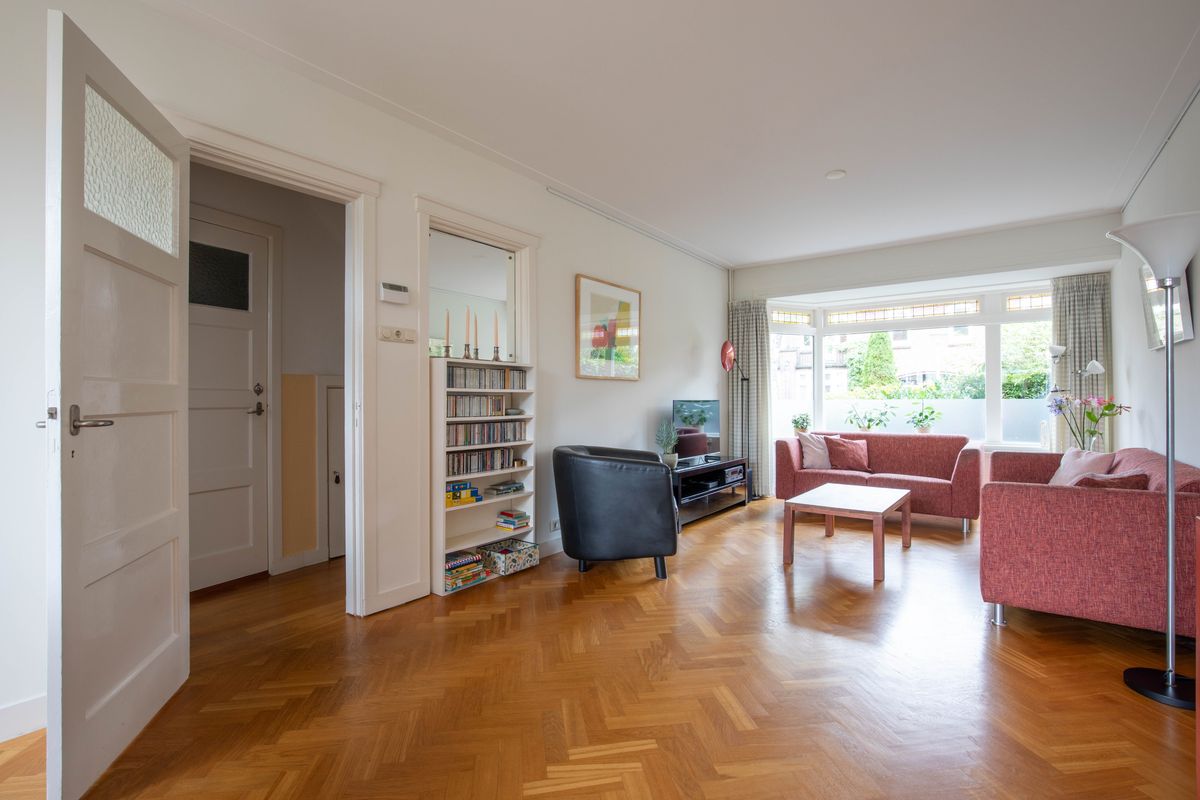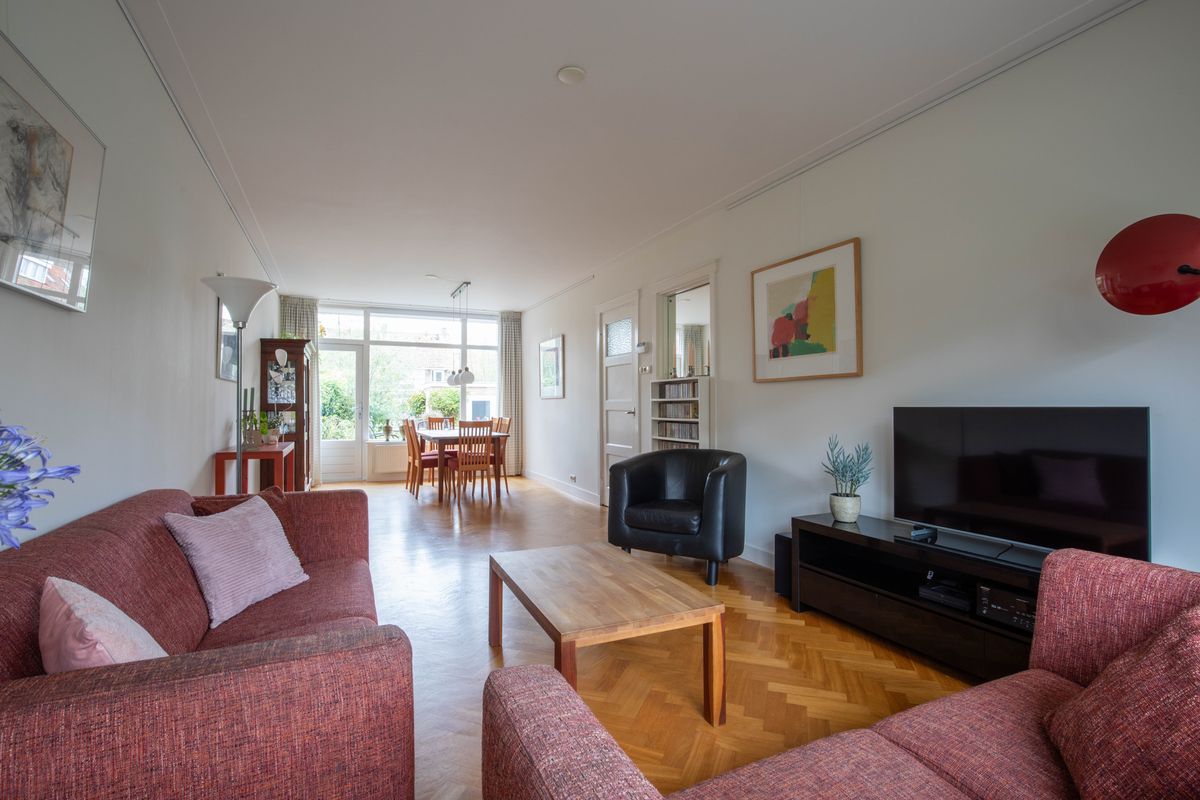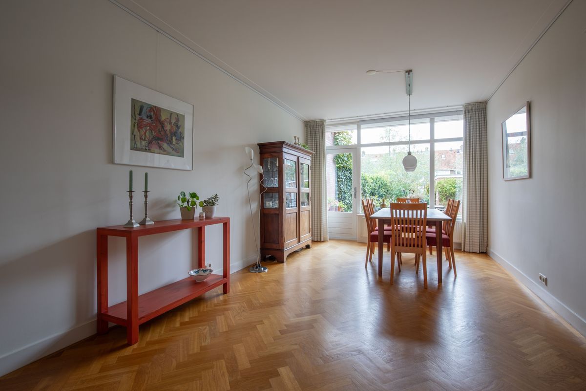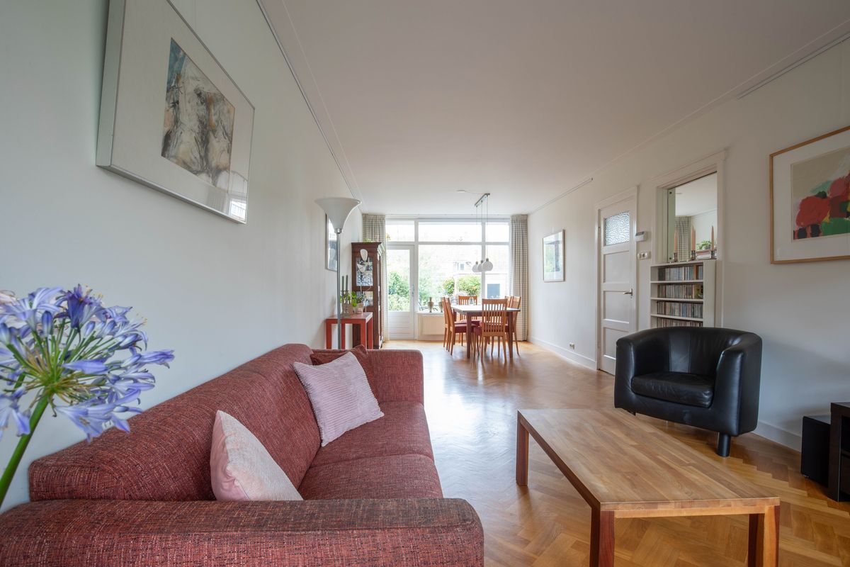 De doorzon woonkamer heeft een sfeervolle erker met ook hier weer de fraaie originele glas-in-lood ruitjes. De zithoek is gesitueerd aan de voorzijde met een leuke kijk op de straat, de eetkamer vindt u aan de achterzijde met een fijn uitzicht op de tuin. Dankzij de grote raampartijen heeft de ruimte een fijne lichtinval. Via de deur bereikt u de achtertuin.