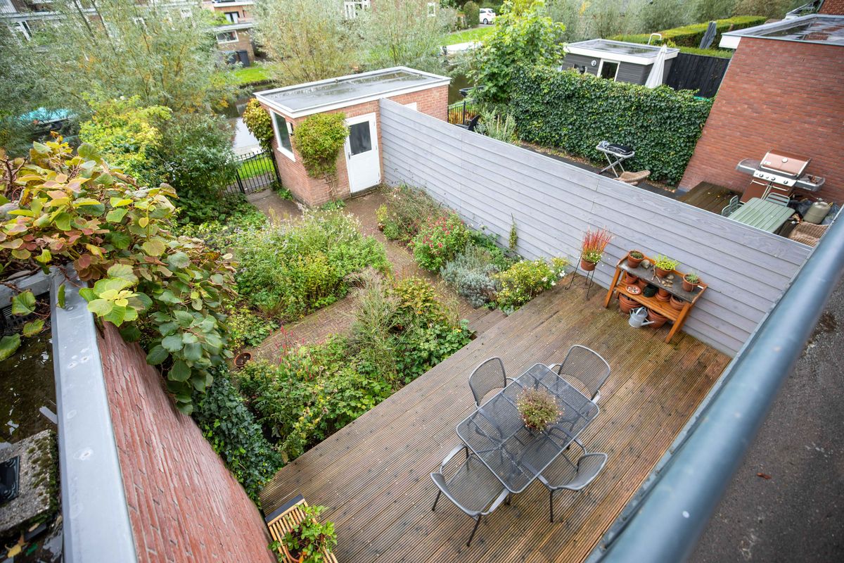 De achtertuin is gelegen op het zonnige zuiden en heeft prachtige borders met volwassen beplanting. Het terras biedt voldoende ruimte voor een grote eettafel of een fijne loungehoek. De berging is ideaal voor de fietsen en het opbergen van de tuinbenodigdheden. De tuin heeft een achterom en is gelegen aan vaarwater, dat in directe verbinding staat met de Poel, via de sluizen zijn de Amsterdamse Grachten te bereiken.