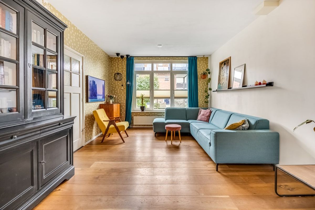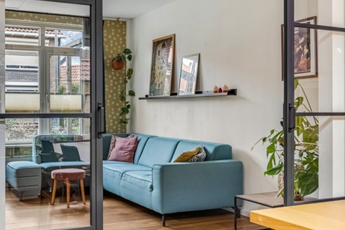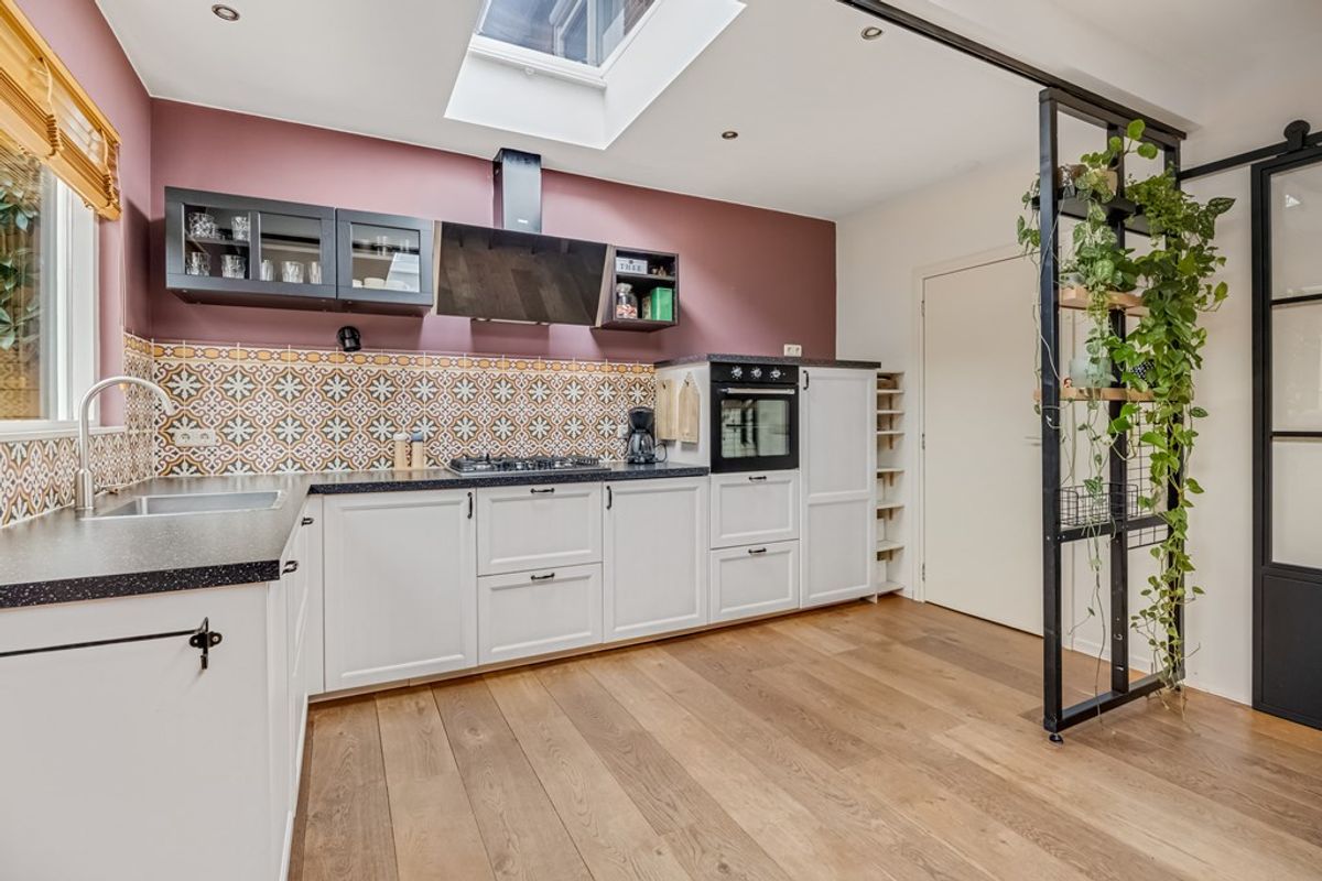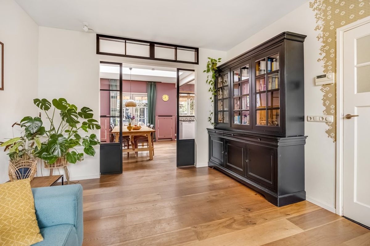 Entree, hal met trapopgang, meterkast (8 groepen) en toilet (2022) met fonteintje. Via de hal kom je in de woonkamer. Aan de voorzijde bevindt zich een gezellige zithoek. Aan de achterzijde ligt de royale uitbouw met een ruime leefkeuken, af te sluiten met moderne stalen schuifdeuren. Dankzij de twee daklichten valt er heerlijk veel daglicht binnen. Zowel de woonkamer als de keuken zijn voorzien van een warme parketvloer.