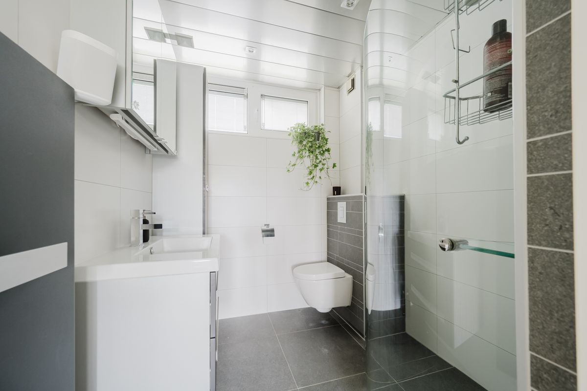 De moderne badkamer is volledig betegeld, heeft een ruime inloopdouche en is voorzien van een hangend toilet, een wastafel- met meubel en een designradiator.