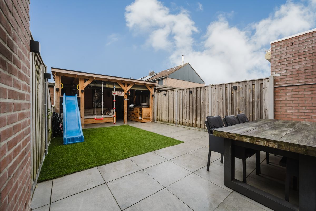 De achtertuin is een echte blikvanger! Dankzij de gunstige ligging op het westen geniet je hier van de middag- en avondzon, perfect voor wie houdt van lange zomerse dagen buiten.