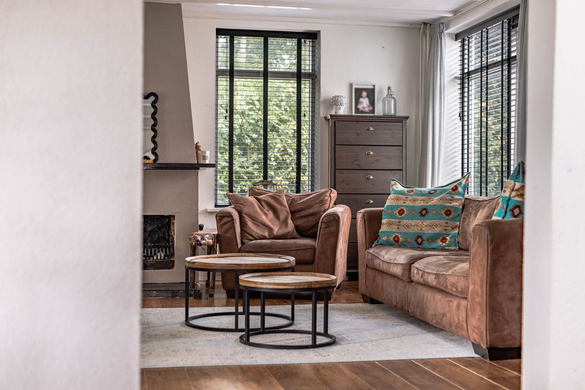 Vanuit de keuken kom je in de knusse woonkamer met balkenplafond en veel ramen, wat zorgt voor een warme, landelijke sfeer.