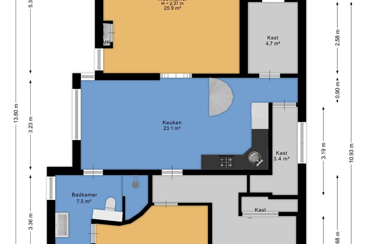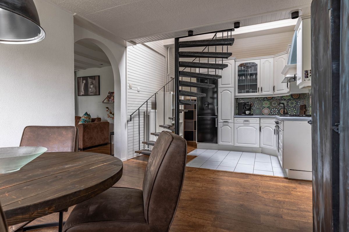 De woonkeuken biedt plek voor een royale eettafel en vormt het hart van de woning. De keuken is circa 10 jaar oud en voorzien van inbouwapparatuur van ongeveer 2 jaar oud.