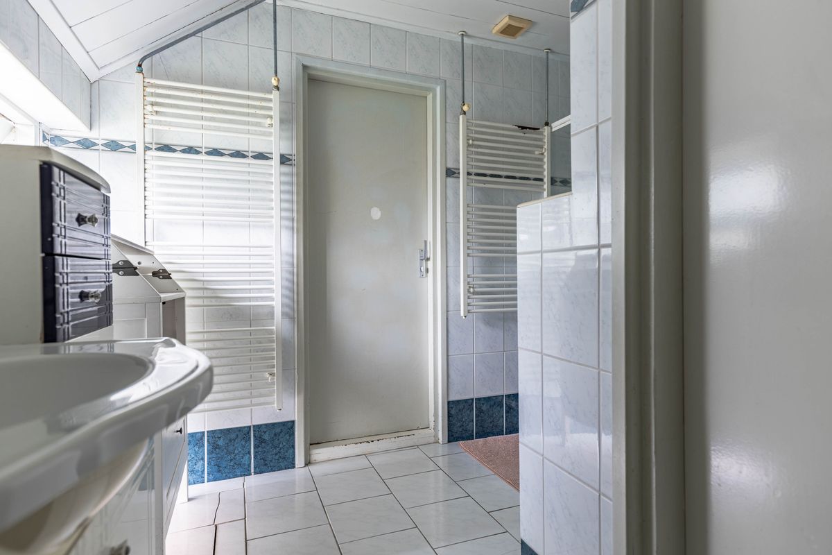 Via de achterzijde van de woning (de hoofdentree) kom je binnen in een ruime hal met aansluitingen voor wasmachine en droger en een praktische inbouwkast. Vanuit hier bereik je een halletje dat toegang geeft tot een slaapkamer met badkamer en toilet, die ook rechtstreeks bereikbaar is vanuit de woonkeuken.