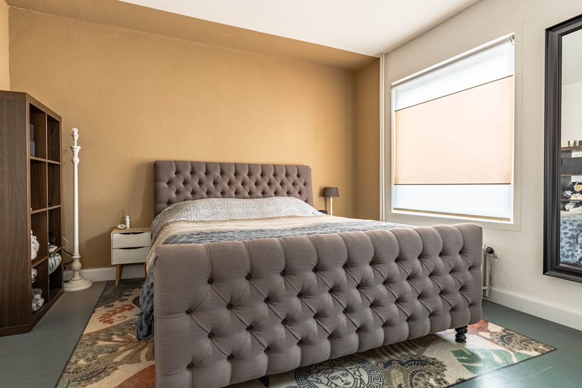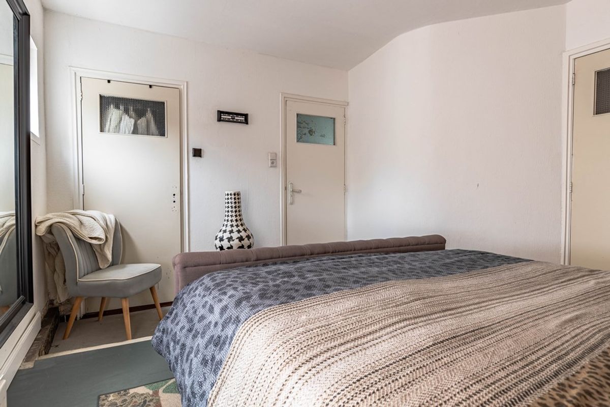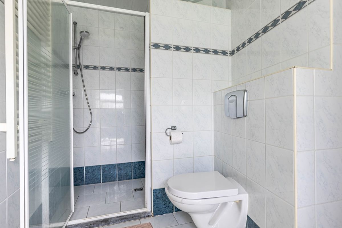 Via de achterzijde van de woning (de hoofdentree) kom je binnen in een ruime hal met aansluitingen voor wasmachine en droger en een praktische inbouwkast. Vanuit hier bereik je een halletje dat toegang geeft tot een slaapkamer met badkamer en toilet, die ook rechtstreeks bereikbaar is vanuit de woonkeuken.
