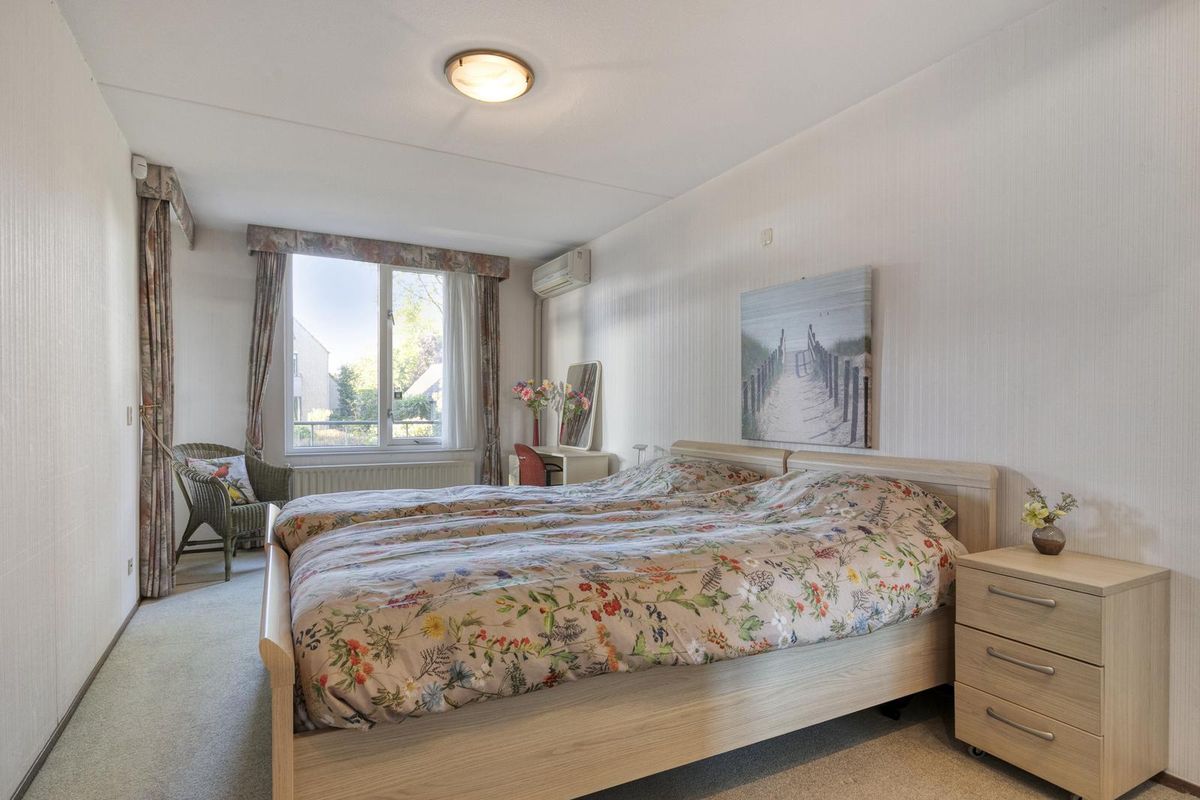 Bij binnenkomst komt u in een ruime hal van waaruit de diverse ruimtes bereikbaar zijn. Allereerst aan de rechterzijde de meterkast en badkamer. Deze royale badkamer beschikt over een comfortabele inloopdouche, een wastafelmeubel en is tevens voorzien van de wasmachine aansluiting. Aan de linkerzijde van de hal bevinden zich de toiletruimte en de praktische berging met Cv-ketel (Vaillant bouwjaar 2009) en veel bergruimte. Aan het einde van de hal zijn de slaapkamers en de woonkamer met open keuken gelegen. De grote slaapkamer is ruim van formaat. Deze slaapkamer biedt u evenals de woonkamer, toegang tot het ruime en zonnige terras. De grote slaapkamer is voorzien van praktische kastruimte. Vanuit de centrale hal heeft u tevens toegang tot de woonkamer en openkeuken. Hier merk je direct bij binnenkomst de fijne, lichte sfeer door de vele raampartijen aan zowel de voor- als aan de rechterzijde van het appartement. De woonkamer is zeer ruim van opzet en biedt voldoende plek voor een royale zithoek. Kortom, een sfeervolle leefruimte met een optimale verbinding richting de omliggende tuin/groenvoorziening en het terras. Het eetgedeelte biedt meer dan genoeg ruimte voor een grote eettafel. Van deze eetkamer is op een eenvoudige wijze een derde slaapkamer/studiekamer te creëren. Ook vanuit de woonkamer heeft u toegang tot het royale terras. Het fraaie terras is gelegen op het zuidwesten. De open keuken in hoekopstelling beschikt over en diverse inbouwapparatuur, zoals een gaskookplaat, een afzuigkap, een oven, een magnetron, een vriezer en een koelkast. De woonkamer en de slaapkamer zijn voorzien van airconditioning.