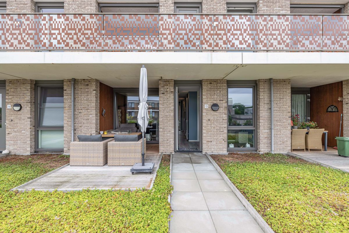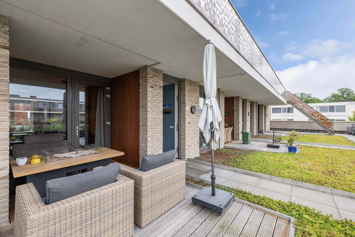 Aan de voorzijde van de woning bevindt zich een deels overdekt dakterras/-tuin op het westen, deze voelt door de groene omgeving meer aan als tuin dan als balkon.