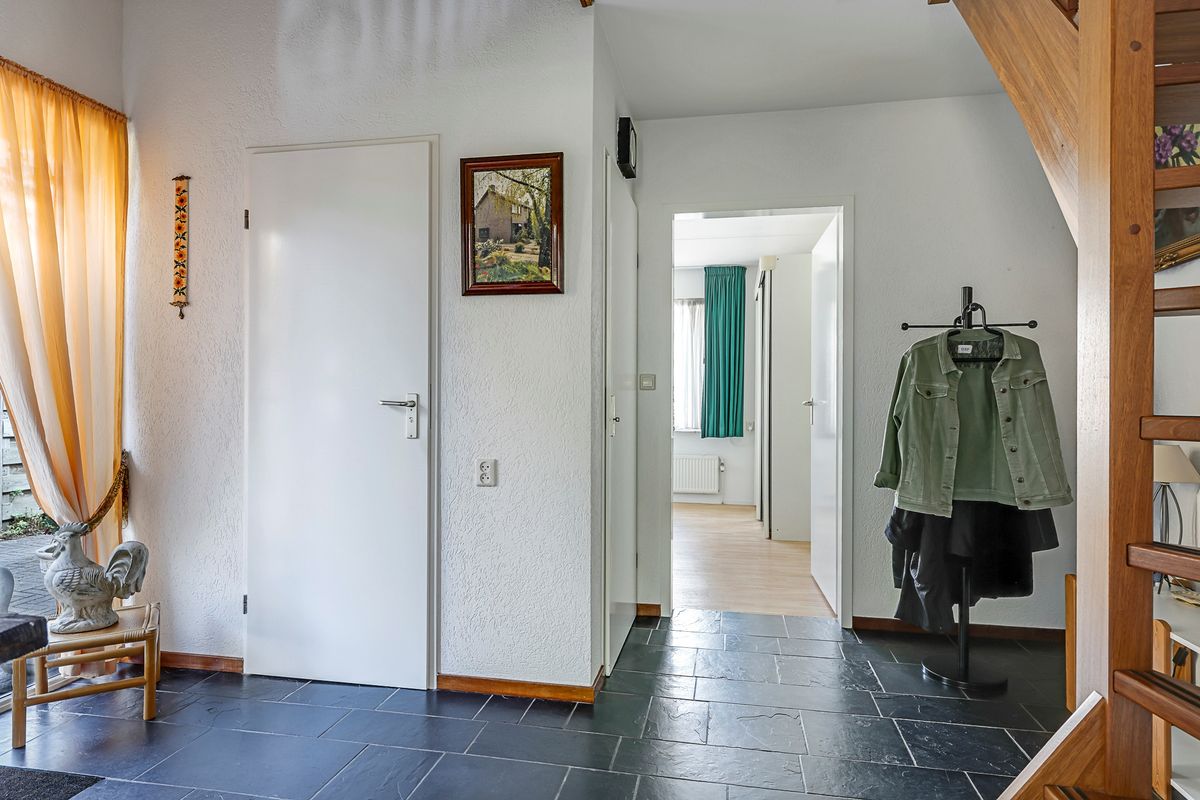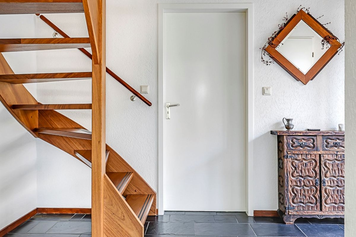 You enter through a very spacious hallway with tiled floor. Here you will find a separate WC with washbasin and the staircase to the first floor. A major advantage of this property: the ground floor features a generous bedroom with an adjoining bathroom in light tones, equipped with a washbasin, walk-in shower and bathtub. In short: ideal for single-level living.