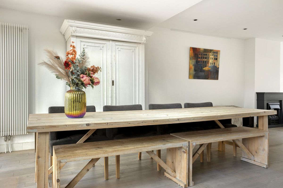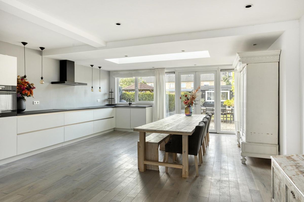 De houten vloer loopt door over de hele begane grond en vormt samen met de strak gestuukte wanden en plafonds een sfeervol geheel. Zodra je de woonkamer instapt, valt de ruimte direct op. Aan de achterzijde is een uitbouw over de volle breedte geplaatst, waardoor woonkamer en keuken samen bijna 50 m² groot zijn. Aan de voorzijde is voldoende plek voor een royale zithoek met een grote hoekbank en losse stoelen.