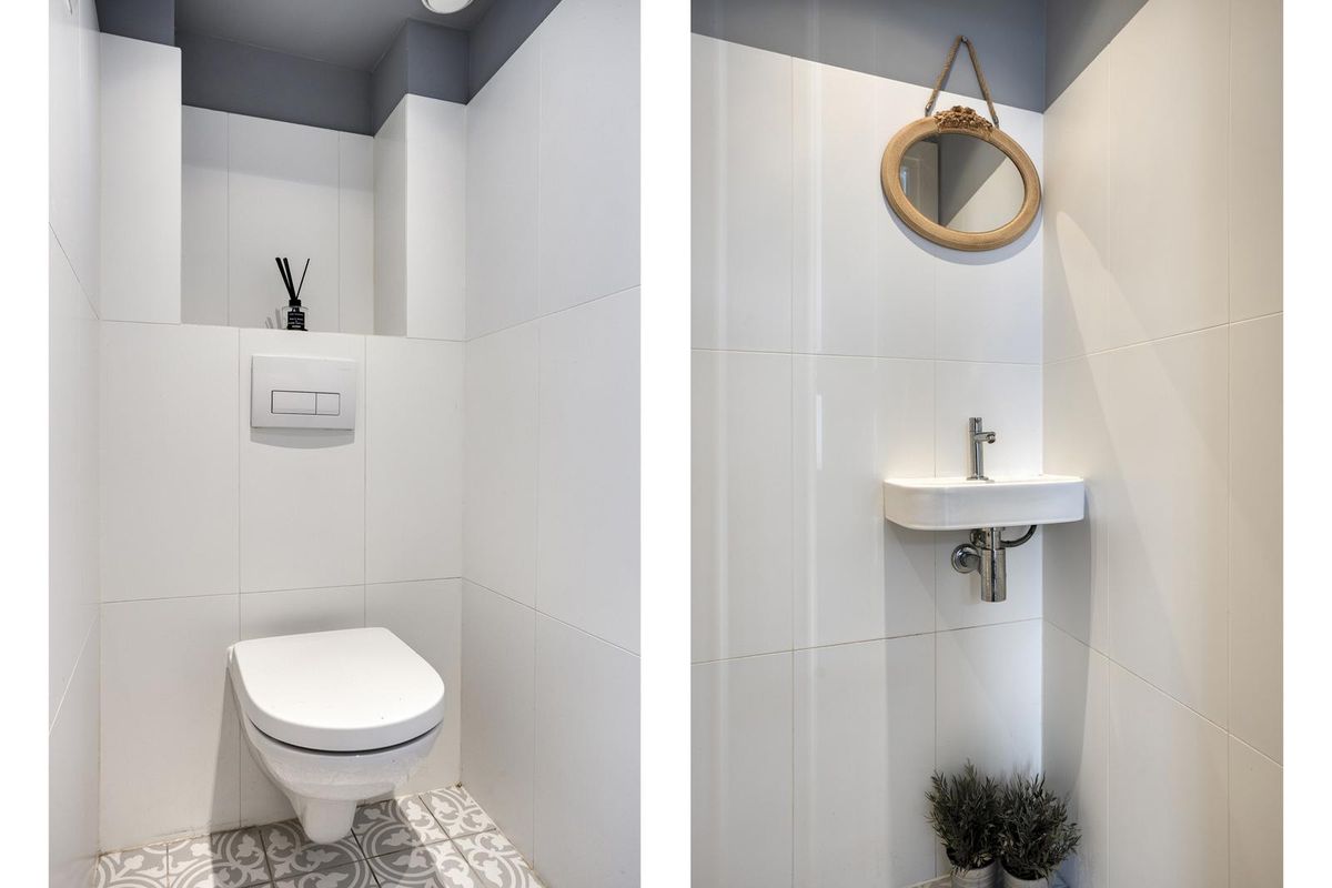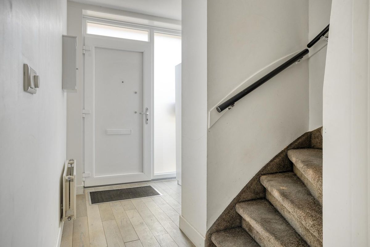Thuiskomen doe je eenvoudig: je parkeert je auto in de straat, pal voor de deur. Via de onderhoudsvriendelijke voortuin stap je binnen door de kunststof voordeur. In de hal vind je de meterkast, trapopgang, trapkast en het toilet. De hal is opvallend breed, waardoor er ruimte is voor een royale garderobe. De meterkast is voorzien van acht groepen, twee aardlekschakelaars en een aparte groep voor de zonnepanelen. Onder de trap is een handige kelderkast met volop bergruimte voor bijvoorbeeld voorraad of schoonmaakspullen. Het toilet is modern afgewerkt met een tegelvloer, deels betegelde wanden, een strak plafond met inbouwspotjes, een fonteintje en een zwevend closet.