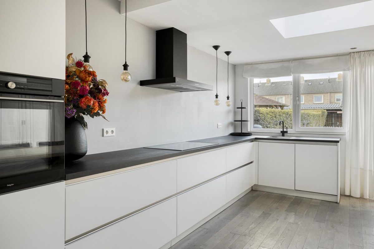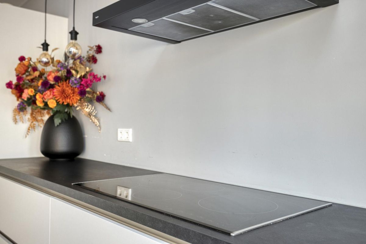 De open keuken bevindt zich in de aanbouw en is van alle gemakken voorzien. De hoekopstelling beschikt over een koelkast, diepvries met drie lades, oven, vijfpits inductiekookplaat met afzuigkap, spoelbak en vaatwasser. Daarnaast is er veel opbergruimte in zes grote lades en diverse kasten. De ruimte is groot genoeg voor een eettafel met 8 tot 10 stoelen. Dankzij de lichtstraat en de grote raampartijen in de achtergevel geniet je hier van een overvloed aan daglicht. Alle kozijnen op deze verdieping zijn uitgevoerd in kunststof met HR++ glas, en zowel de vloer, de muren als het dak van de aanbouw zijn geïsoleerd. Ook het dak van de woning zelf is voorzien van isolatie, wat bijdraagt aan het energielabel B.