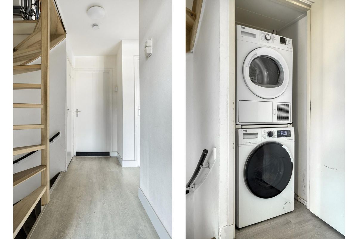 De tweede verdieping bereik je via een vaste trap. Op de voorzolder hangt de Intergas HR-combiketel uit 2015 en aan zowel de voor- als achterzijde zijn schuifwanden gemaakt onder de schuine kap, ideaal voor extra opbergruimte. De grote slaapkamer op deze verdieping heeft een vloeroppervlakte van 17,9 m² en is daardoor perfect als tienerkamer, hobbyruimte of logeerkamer. Er is een groot dakraam aan de voorzijde, de vloer is afgewerkt met modern laminaat en de muren zijn strak gestuukt. Het plafond bestaat uit houten balken met geïsoleerde dakplaten, wat zorgt voor een warme, gezellige uitstraling. Ook hier zijn aan beide kanten schuifwanden geplaatst.