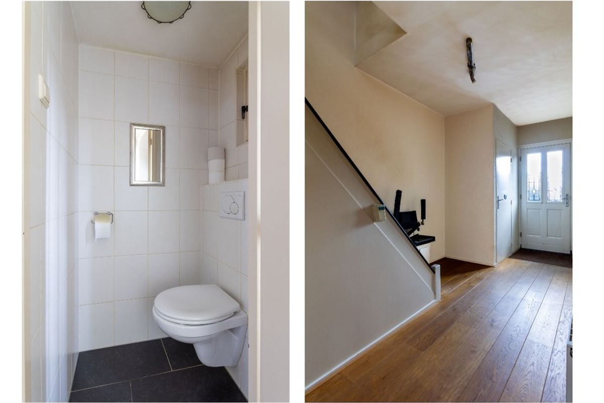 Bij binnenkomst kom je in de hal met meterkast, toilet en trapopgang naar de eerste verdieping. Vanuit de hal stap je de woonkamer binnen, die zich aan de voorzijde van de woning bevindt en volop ruimte biedt voor een comfortabele zit- en eethoek. Dankzij de grote raampartijen geniet je hier van een prettige lichtinval.