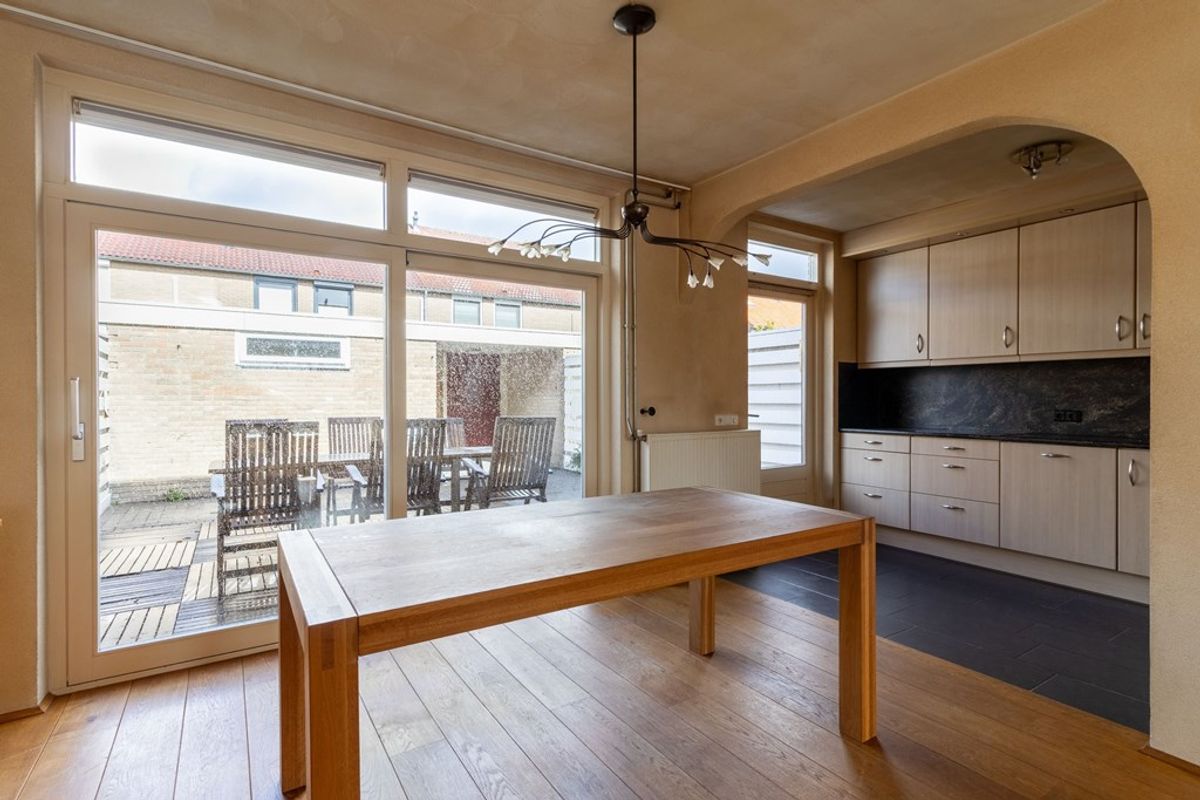 Achterin de woning bevindt zich de keuken, praktisch ingedeeld en voorzien van de benodigde inbouwapparatuur.