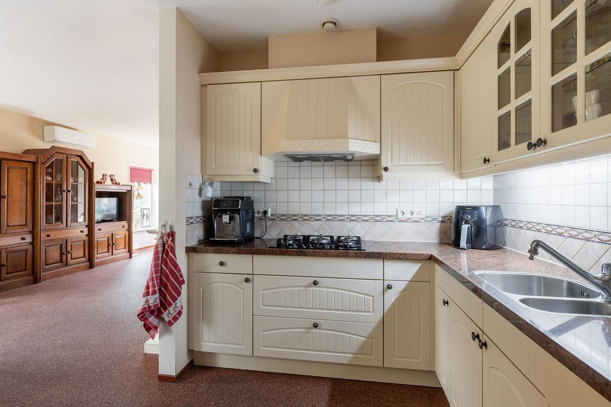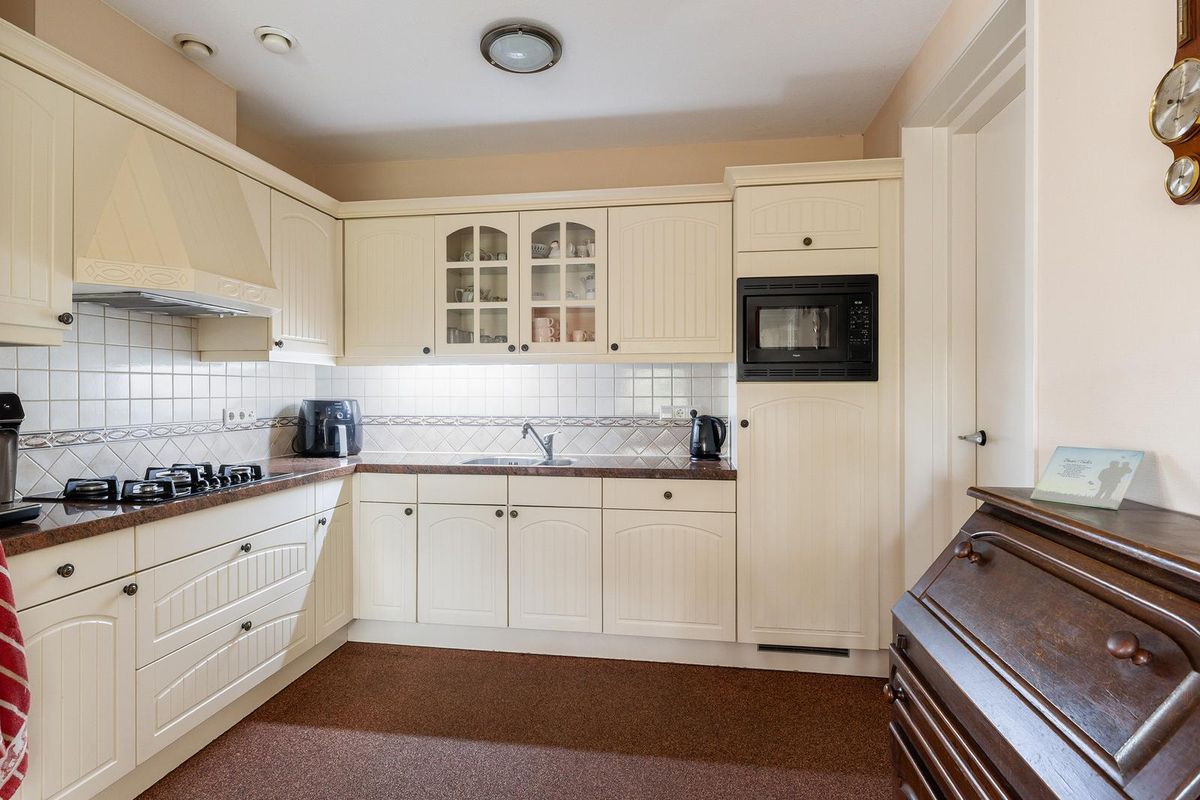 De keuken is in hoekopstelling geplaatst en voorzien van een 5-pits gaskookplaat, afzuigkap, combimagnetron, koelkast, vaatwasser, dubbele spoelbak, bovenkasten en een natuurstenen werkblad.