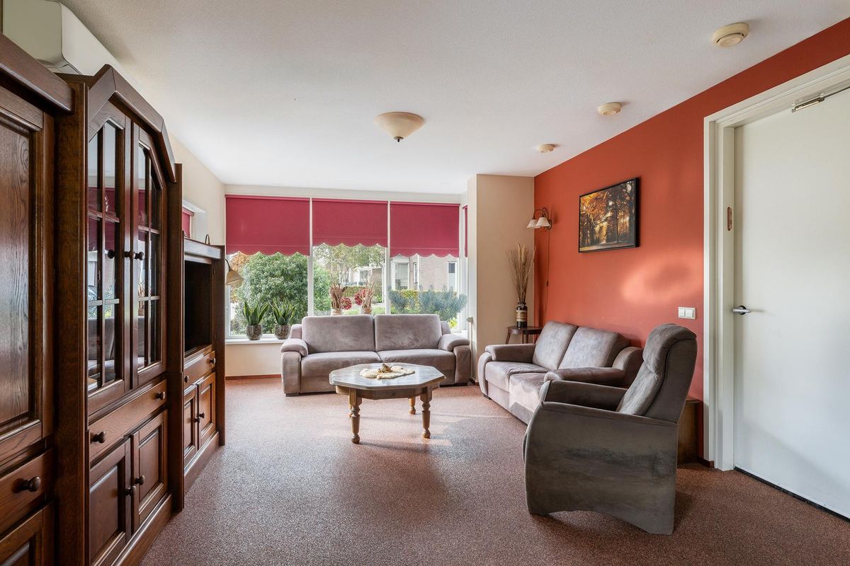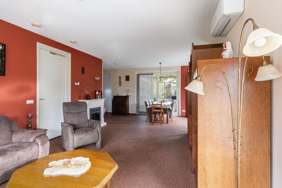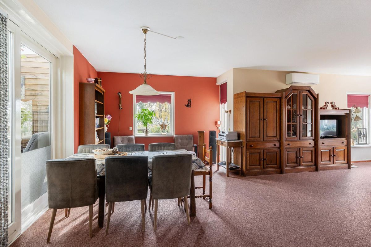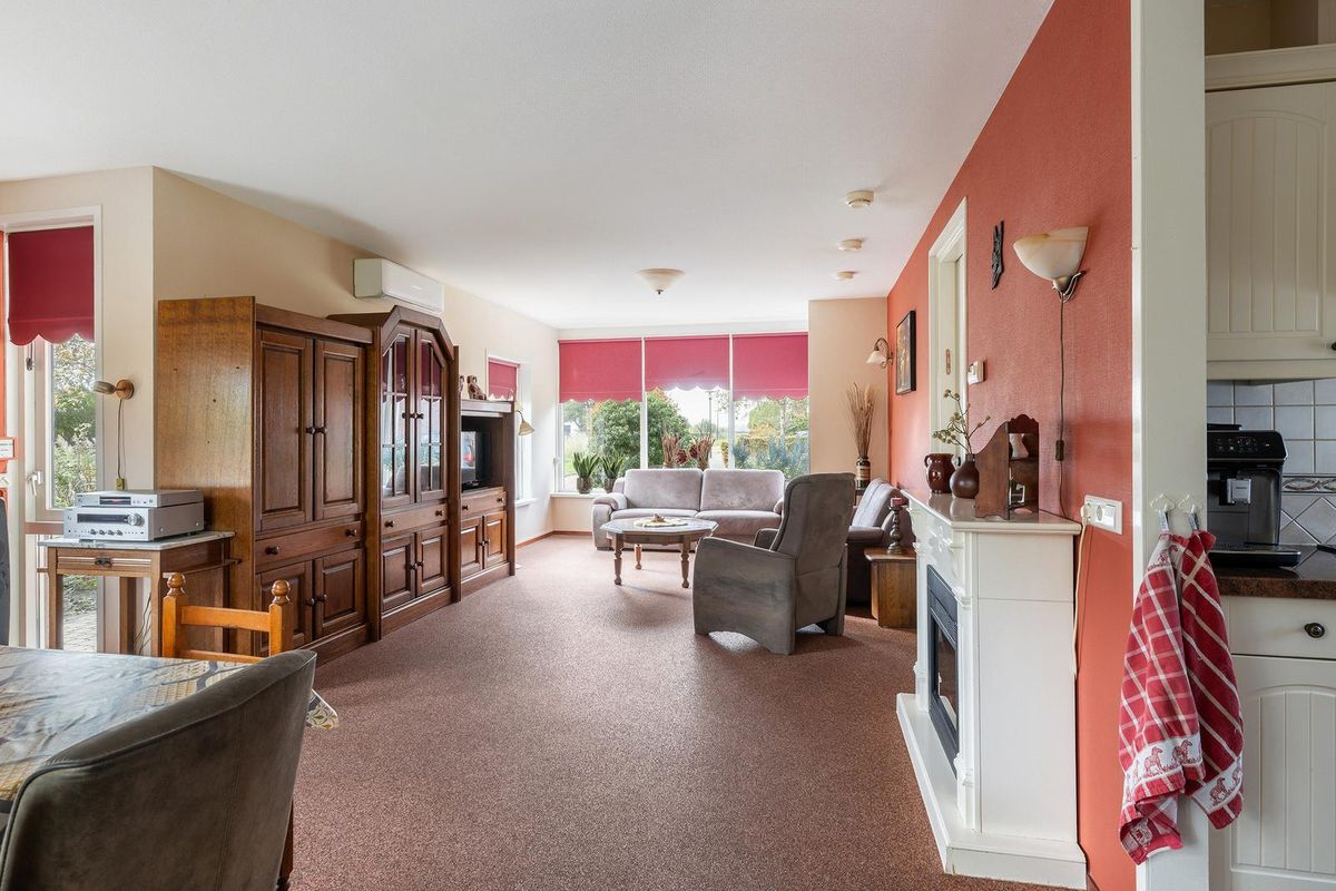 Riante woonkamer met airco (verwarming en koeling), elektrische rolluiken aan de voor- en zijkant, een erker, elektrische sierhaard, tv-aansluiting, schuifpui naar de overkapping en een doorloop in de open keuken. NB: De foto's van de woonkamer zijn nabewerkt; het stuukwerk van het plafond laat daar los. Verkopert zorgt er voor dat het stuukwerk van het plafond op de overdrachtsdatum saus klaar wordt opgeleverd.