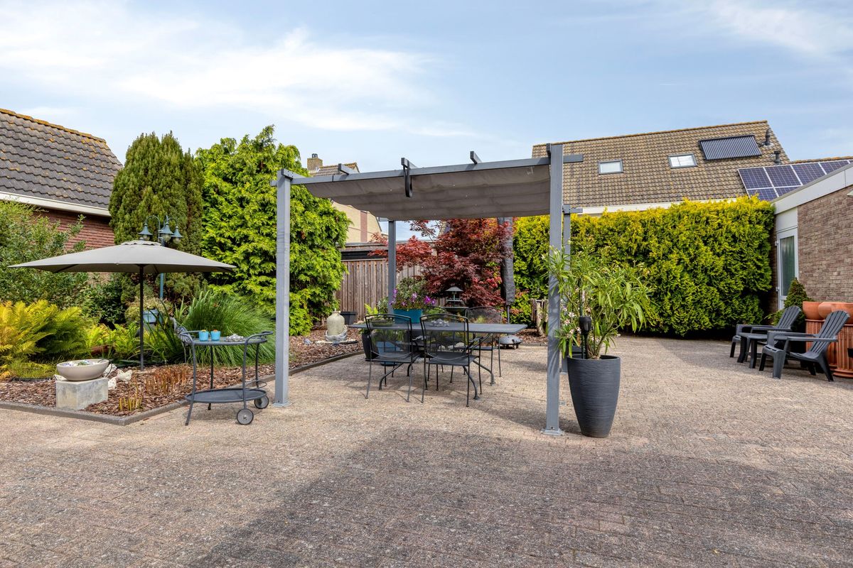 De tuin rondom de woning is fraai aangelegd en met zorg bijgehouden. Aan de voorzijde is de tuin/oprit afgesloten met een (ook vanuit binnen) elektrisch bedienbare poort. Naast/achter de woning staat een riante garage, met daarvoor een lange oprit met plaats voor wel 3 a 4 auto’s.
