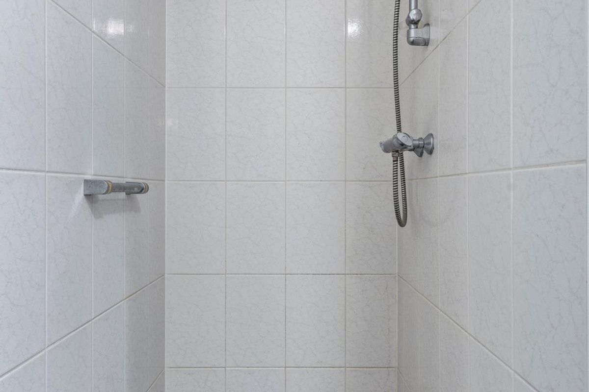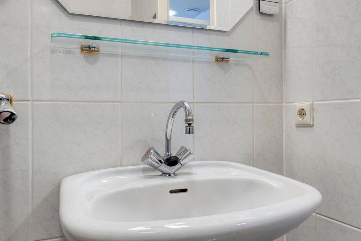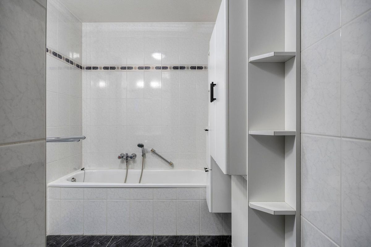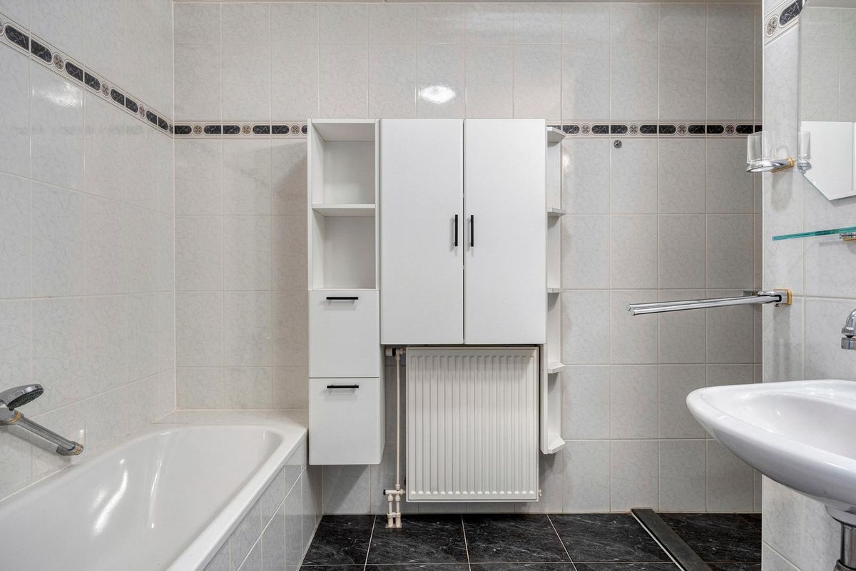 De badkamer is betegeld en uitgerust met een ligbad, inloopdouche, wastafel en radiator.